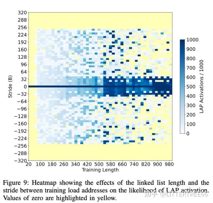 结合这张图我们就能清楚的发现,横轴:训练长度(Training Length),纵轴:步长(Stride)。颜色深度:蓝色区域表示 LAP 高激活概率。黄色区域表示 LAP 失效。由图可知,LAP 需要 ≥ 500 次训练才能稳定激活。步长必须 ≤ 255 字节,超出范围 LAP 不会预测。