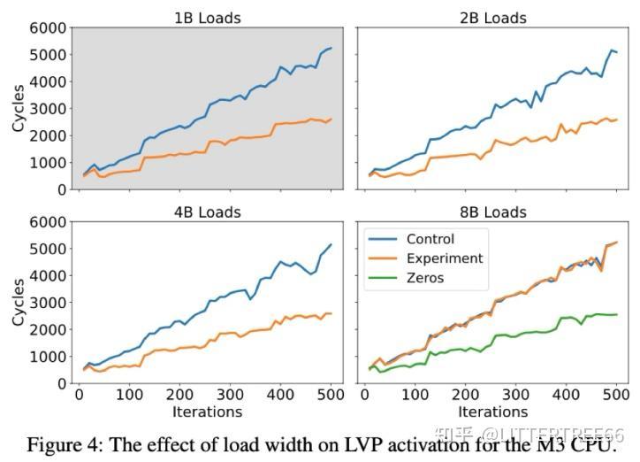 该图展示了 LVP 在不同 load 宽度(1B, 2B, 4B, 8B)下的表现。在 M3 P-core 上,分别测试 1B、2B、4B 和 8B 的 load 指令,并记录执行时间。从结果来看,1B, 2B, 4B 负载 LVP 成功预测,执行时间降低。8B 负载 LVP 仅在返回值为 0 时激活,否则失效。所以,Apple 可能通过限制 8B 负载的预测,防止LVP直接预测 64-bit 指针值,以减少潜在的安全风险。