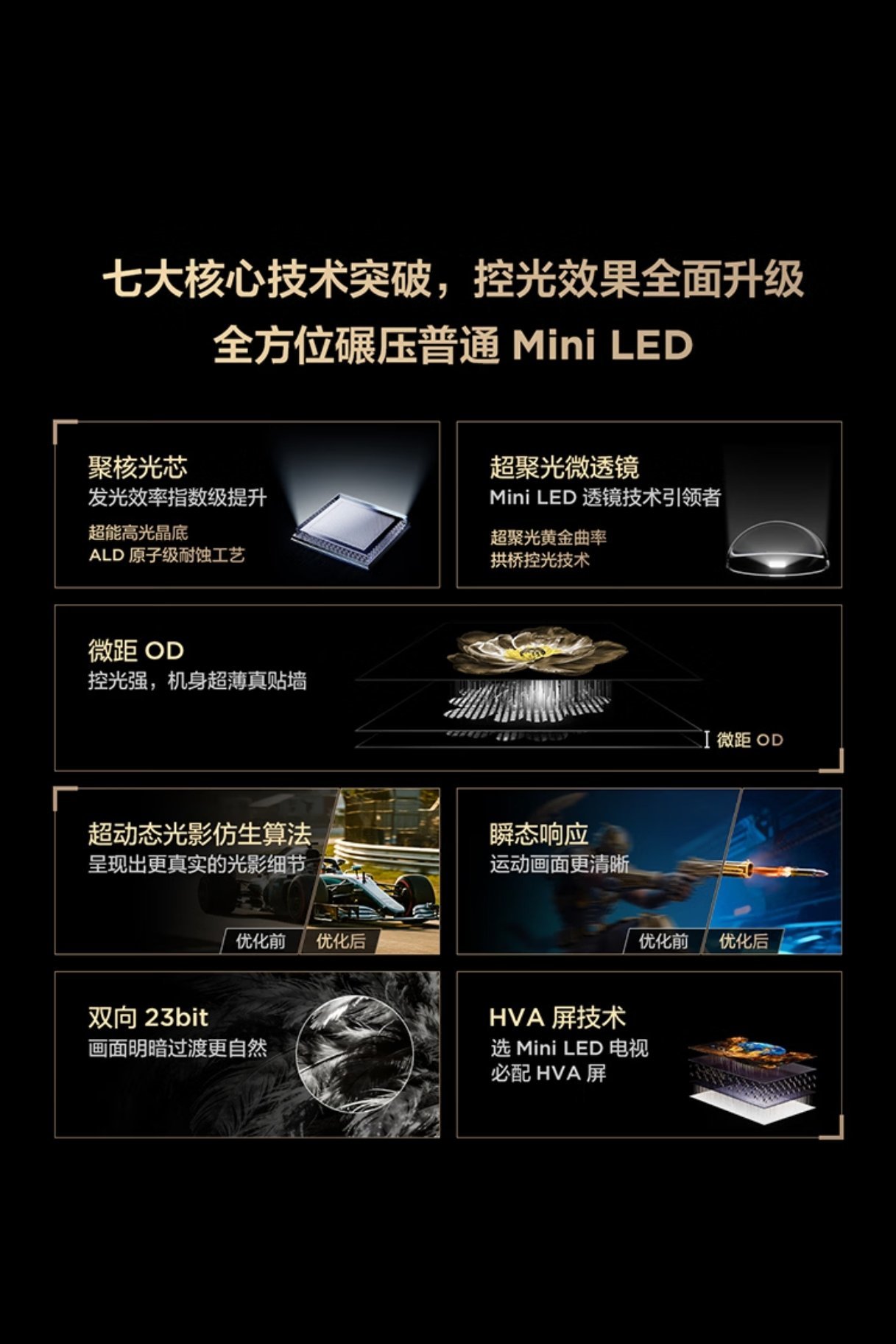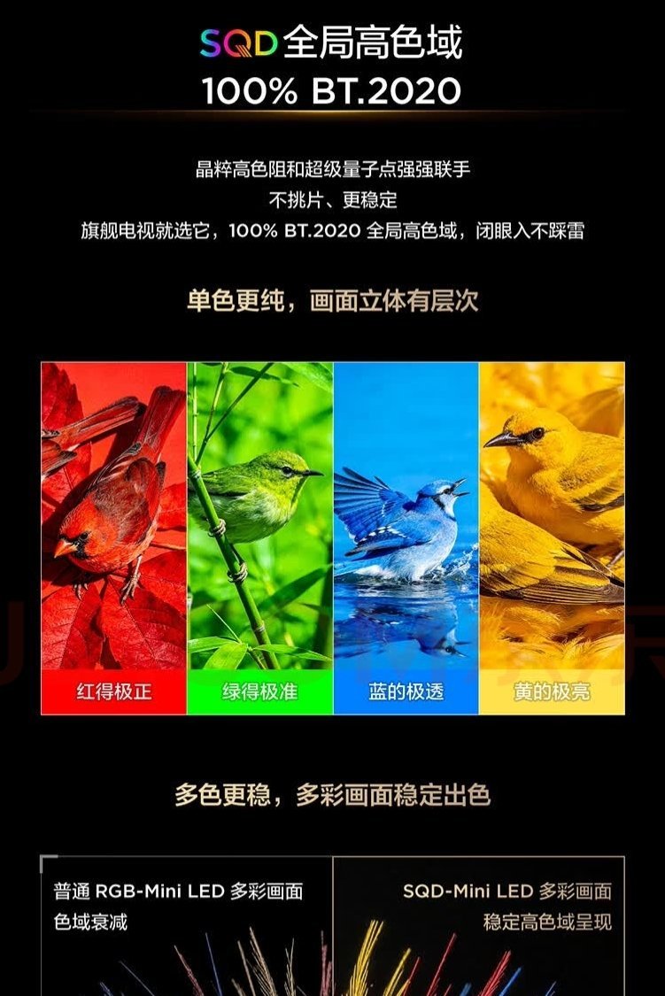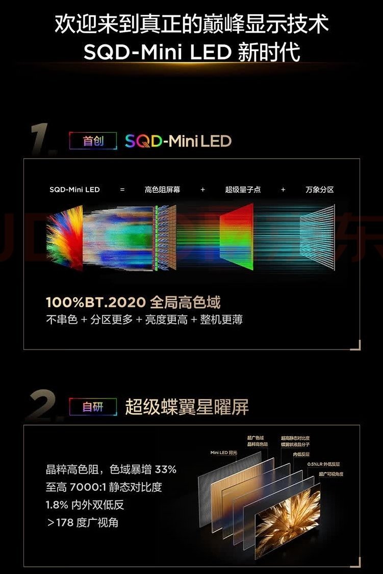 85英寸鶴7 26款採用的是SQD-MiniLED,搭配超級蝶翼星耀屏,支持1056萬象分區,靜態對比度可達7000:1,峯值亮度2200nits。