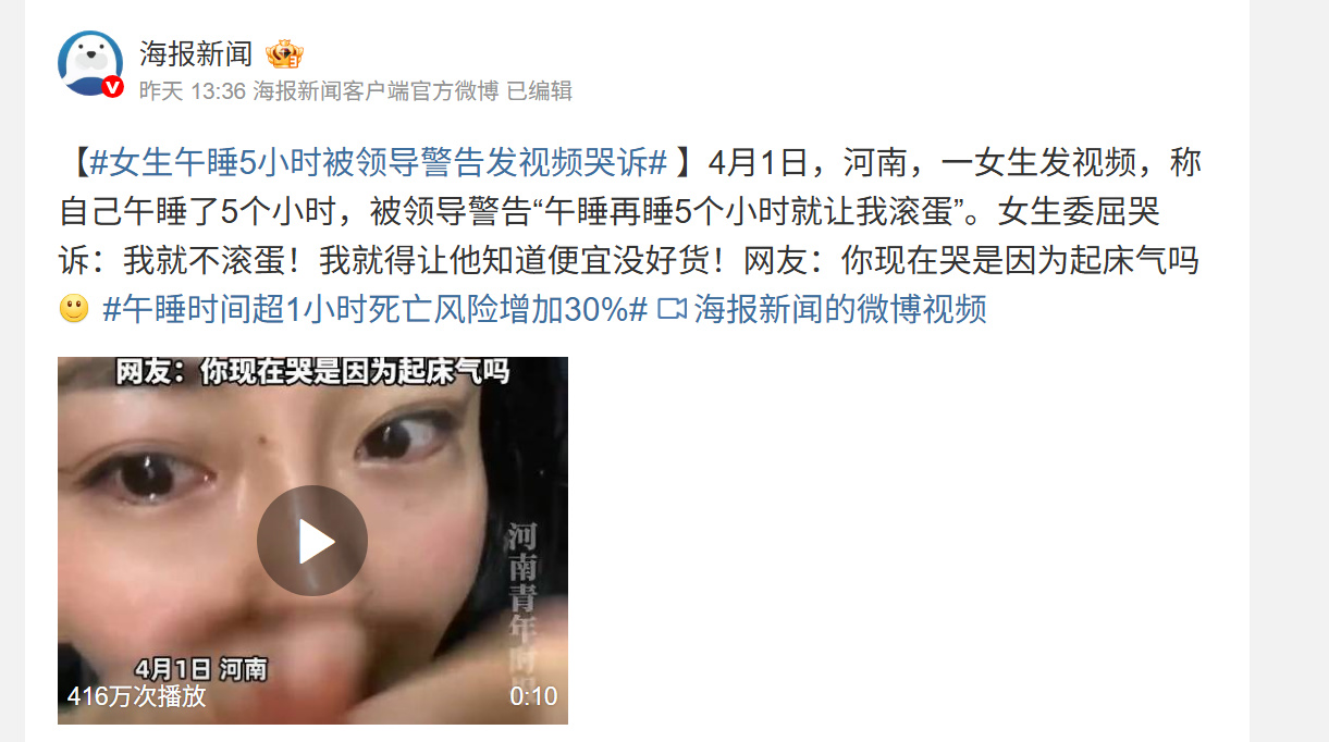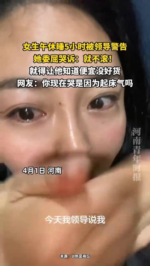 河南一女生因午睡時長“逆天”被領導下通牒:再睡5小時就捲鋪蓋走人。這位“覺皇”非但沒認慫,反而在視頻裏硬氣回懟,聲稱自己堅決不滾,非要讓公司明白低薪招人就得承擔這種“摸魚”代價。