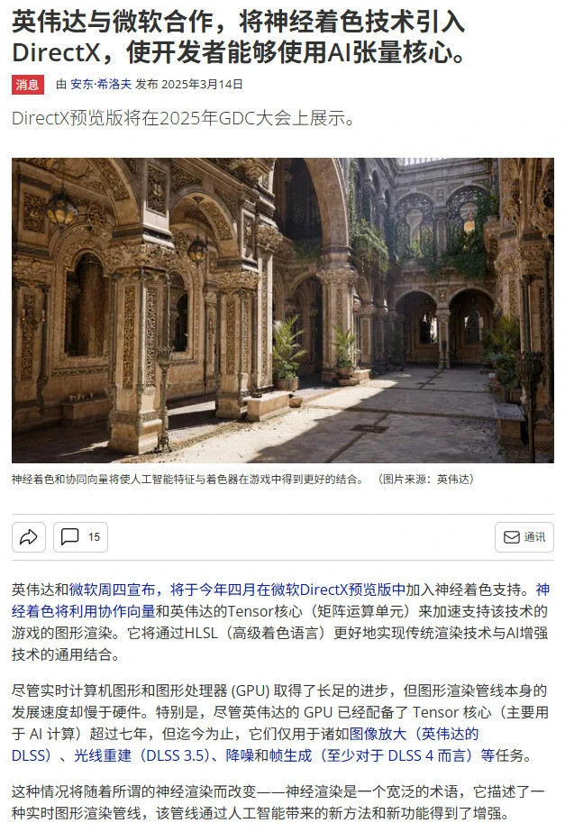 從行業格局來看,NTC技術的發佈並非英偉達的孤軍奮戰。微軟已在DirectX 12着色器模型6.9中引入“協作向量”特性,爲神經紋理壓縮提供了標準化接口,英偉達NTC技術可依託該特性實現跨平臺兼容。與此同時,AMD、英特爾等廠商也在加速神經壓縮技術佈局,AMD此前披露的神經紋理塊壓縮(NTBC)技術可實現遊戲安裝容量最高70%的縮減,英特爾也展示過類似的紋理壓縮方案,行業正共同推動神經渲染技術從概念走向落地。