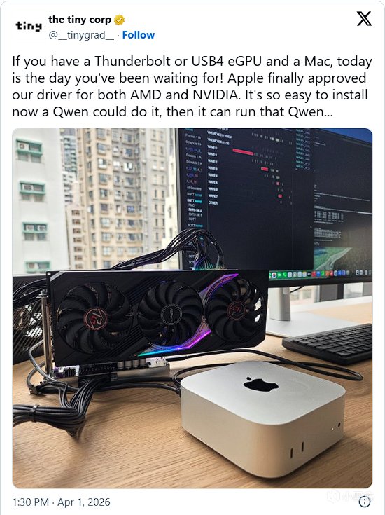 Tiny Corp在X平臺發文稱,Apple** reportedly 已批准Nvidia eGPU驅動程序,允許用戶將外部GPU與Mac配對用於AI LLM處理。該驅動結束用戶需禁用System Integrity Protection**等變通方案的歷史,安裝流程大幅簡化。