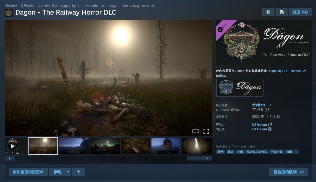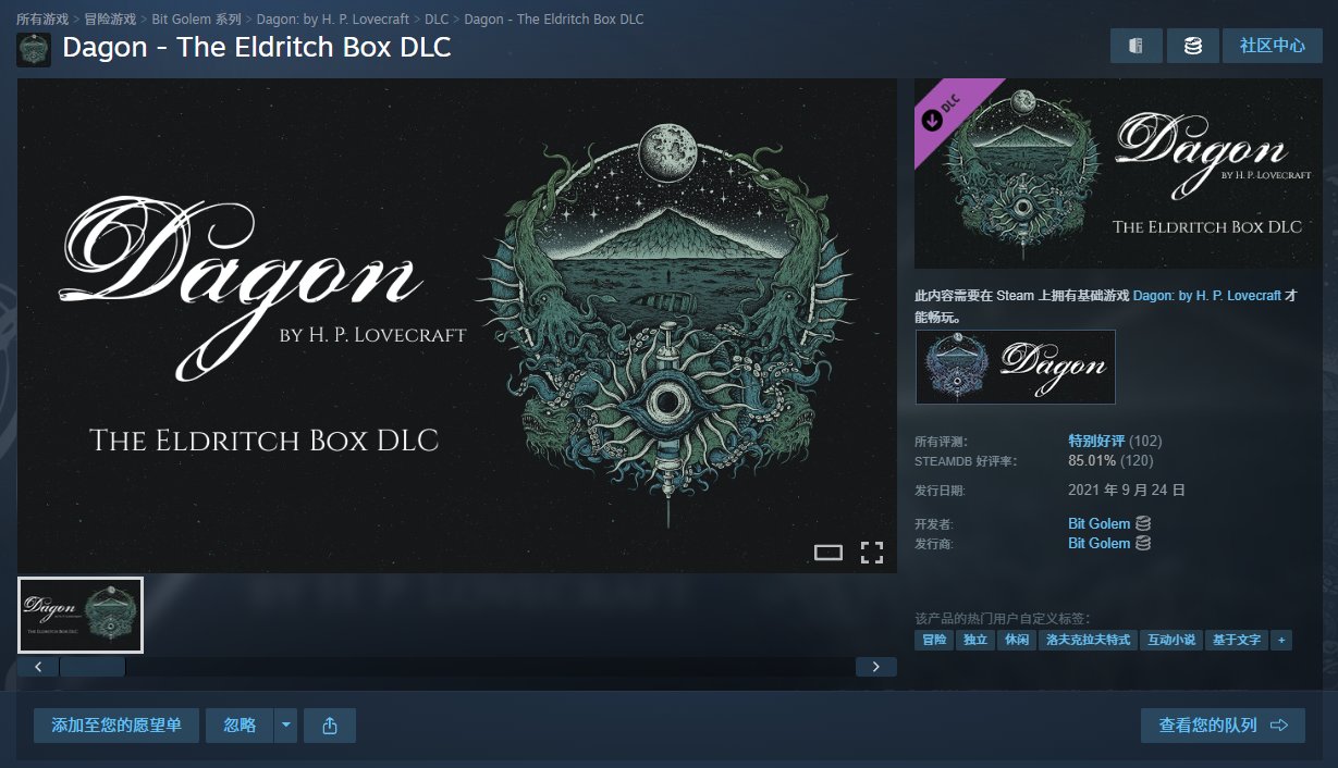 纯收藏性质的《惊骇之盒》(The Eldritch Box)虽然没有新增游戏流程,但它包含了多种语言(包括中文)和格式的《大衮》电子书及其英文有声读物,还收录了启发过《大衮》创作的英文小说《鱼头》。