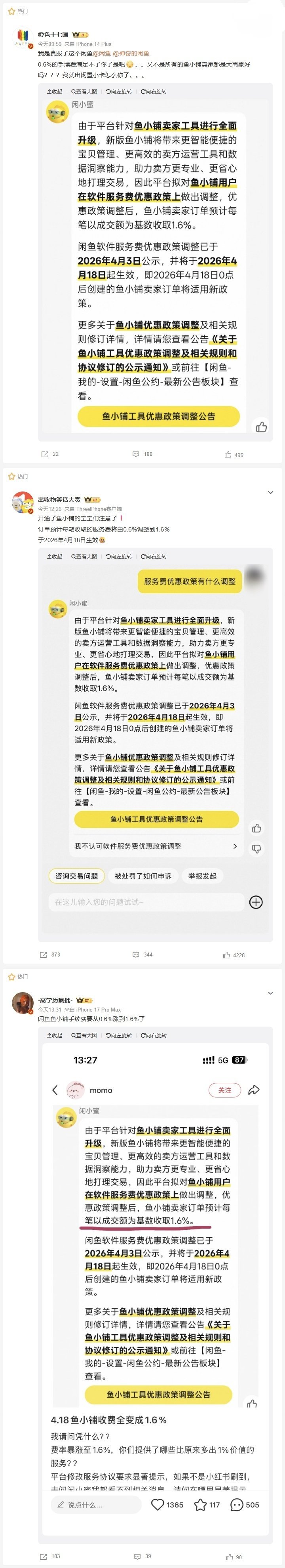 另有天津用户表示:"我已经立刻关掉了,还好最近没什么交易。有人问客服说是18号之后开通鱼小铺再交易的才收1.6%,之前开的还是0.6%,但是我不太想相信客服的说辞,关了得了"。也有用户评论直指"吃相好难看"。