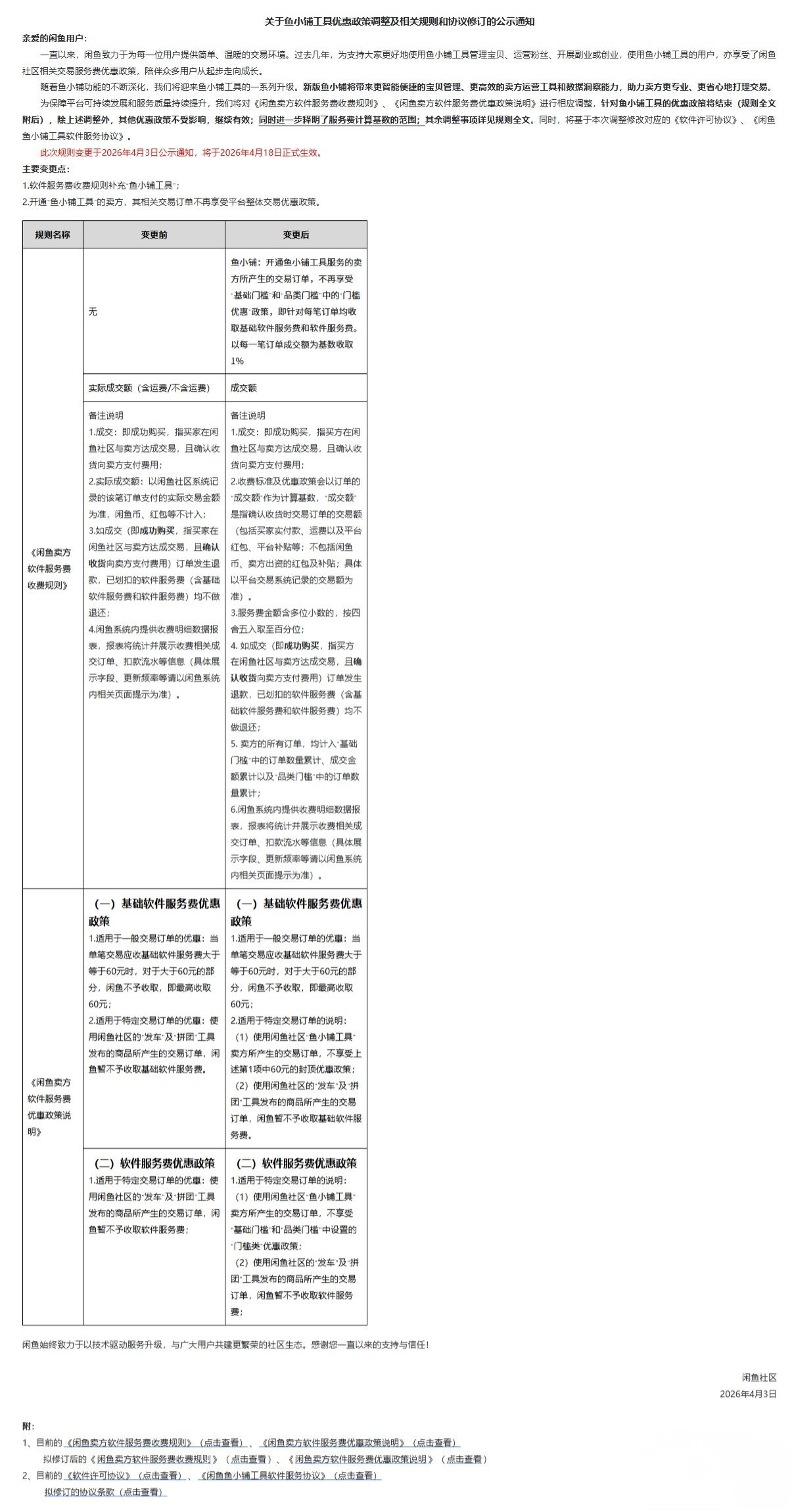 根据公告,此次规则变更已于2026年4月3日公示,将于2026年4月18日正式生效。核心调整在于:开通"鱼小铺工具"服务的卖家,其交易订单将不再享受平台原有的交易优惠政策,转而执行1.6%的软件服务费率,以每笔订单的成交额为基数计算。