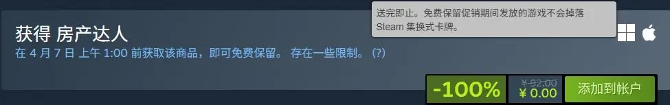 原價92元的《房產達人》以及兩款DLC,於北京時間04.07,1:00截止免費領取