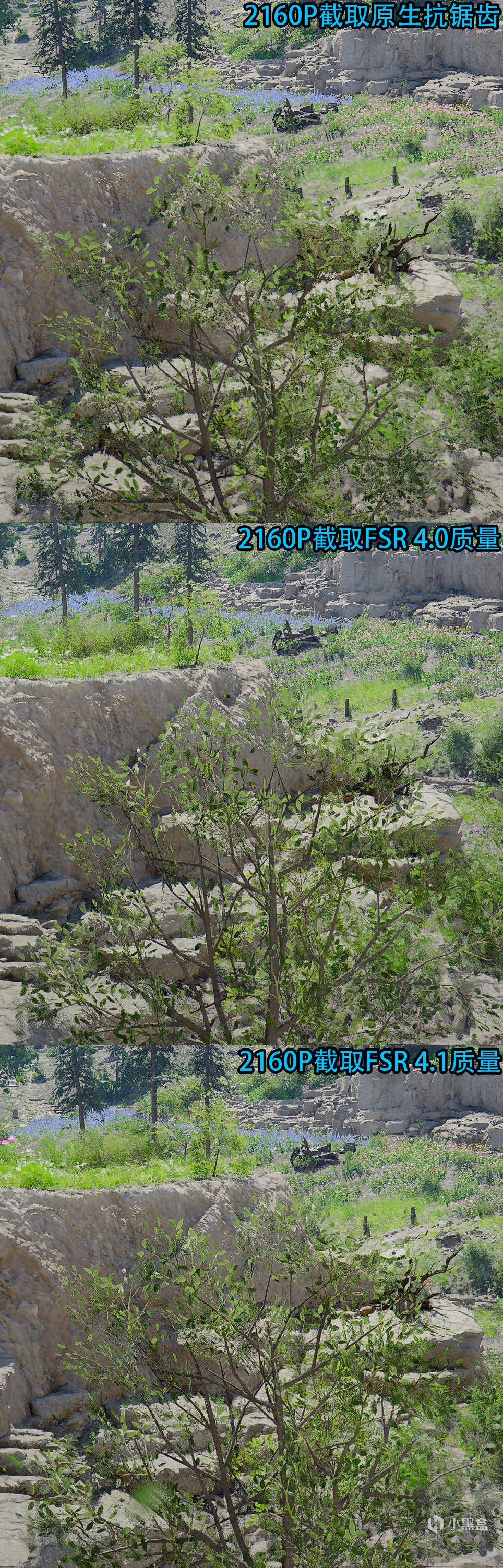 《红色沙漠》拥有细致的模拟特性,风在吹过草木时会呈现真实摆动,类似于这种物体的运动轨迹,原生抗锯齿没法处理好运动矢量,导致出现重影感,FSR 4.1和4.0均能让这些部分细节层次分明,并减少拖影。不过4.1相比4.0版本,个人目前还体会不到区别,可能是因为运动轨迹幅度还不够大,倒是光追降噪器确实是升级了光影质感。