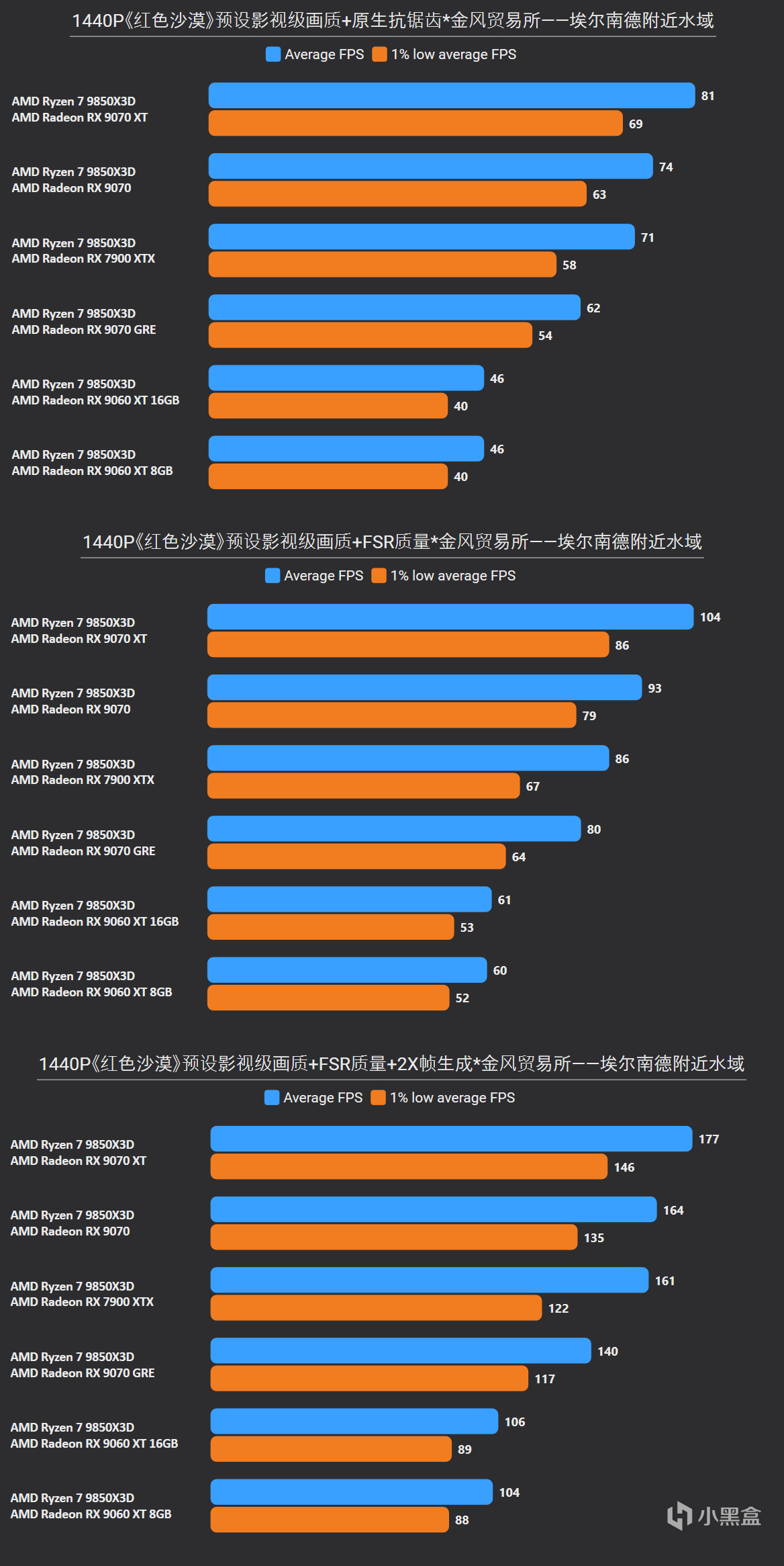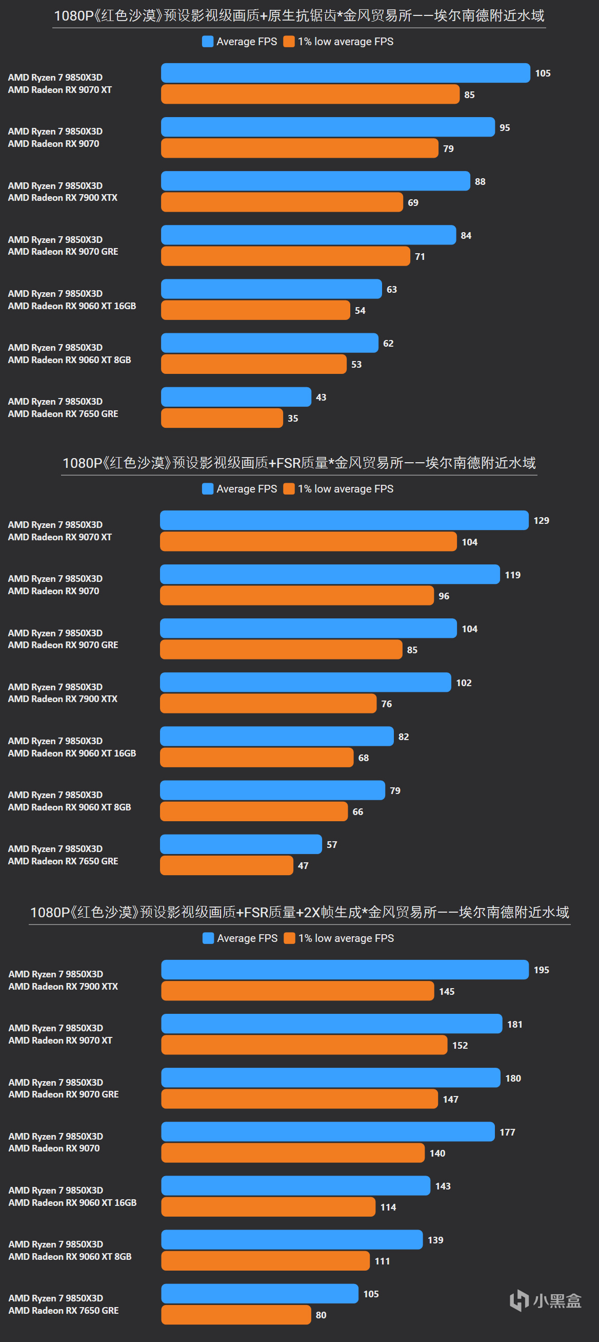 值得一提的是,原生状态下只有RX 9070 XT才可满足基本高刷,开启FSR后也是帧率最高,不过在叠加2X帧生成下,RX 9070 XT、RX 9070和RX 9070 GRE三者平均帧几乎一致,倒是1% LOW帧能划分等级。