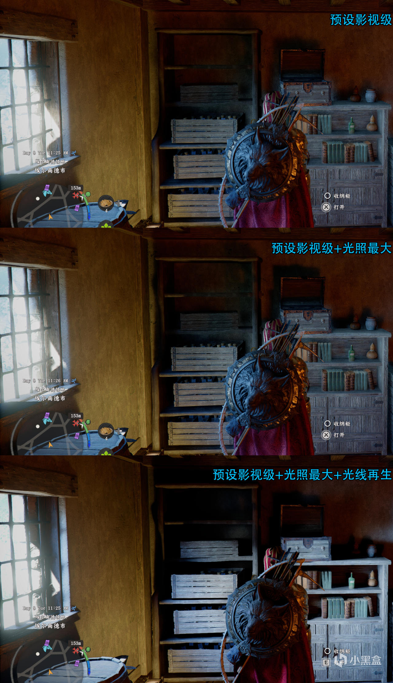 虽然游戏默认已开启光追,不过影视级画质下表现力仍可进一步提升,光照品质还可以进一步提升至“最大”档位,开启后能看到画面中室内部分物体阴影更重了,但人物本身和整体氛围感还是没有变化的,所以开发组并没有将预设影视级画质中的光照品质拉到最大,显然这样做损失性能太大,画质提升又不明显。