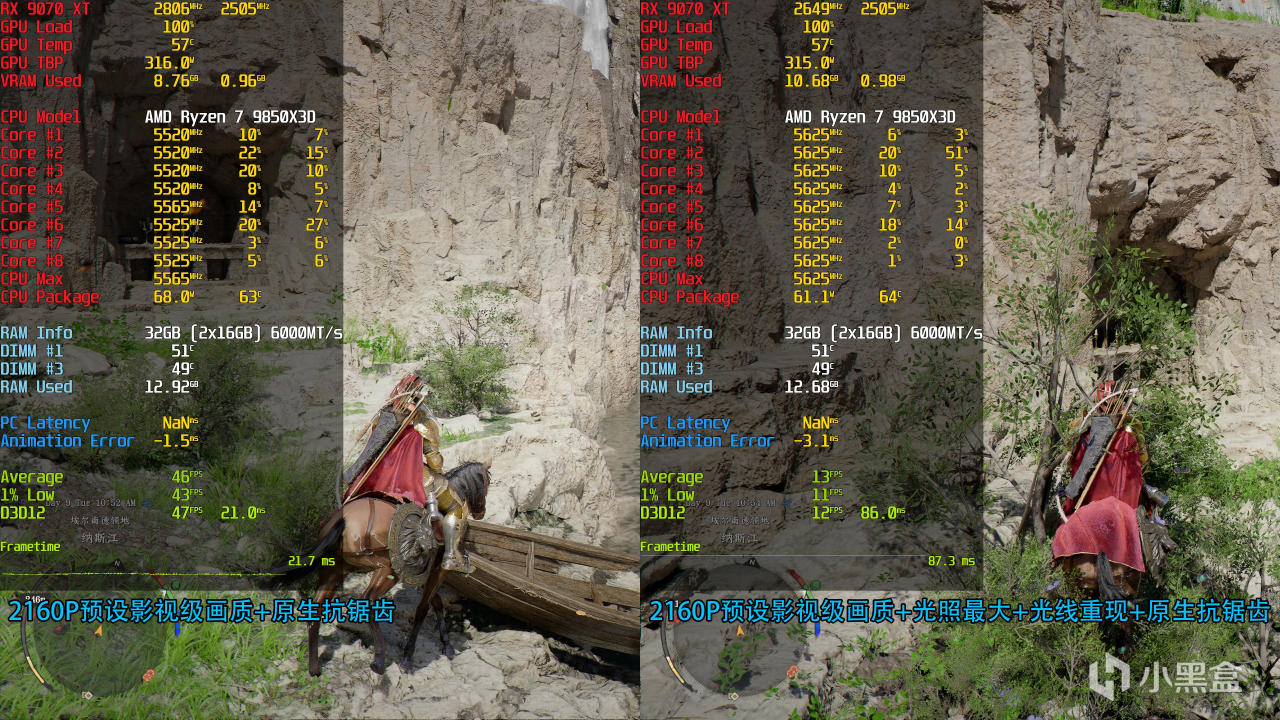 4K原生抗锯齿下,渲染压力相当大,最强的RX 9070 XT平均帧率也只有47fps,强烈建议开启FSR 4.1后达成平均67fps就很完美了。
