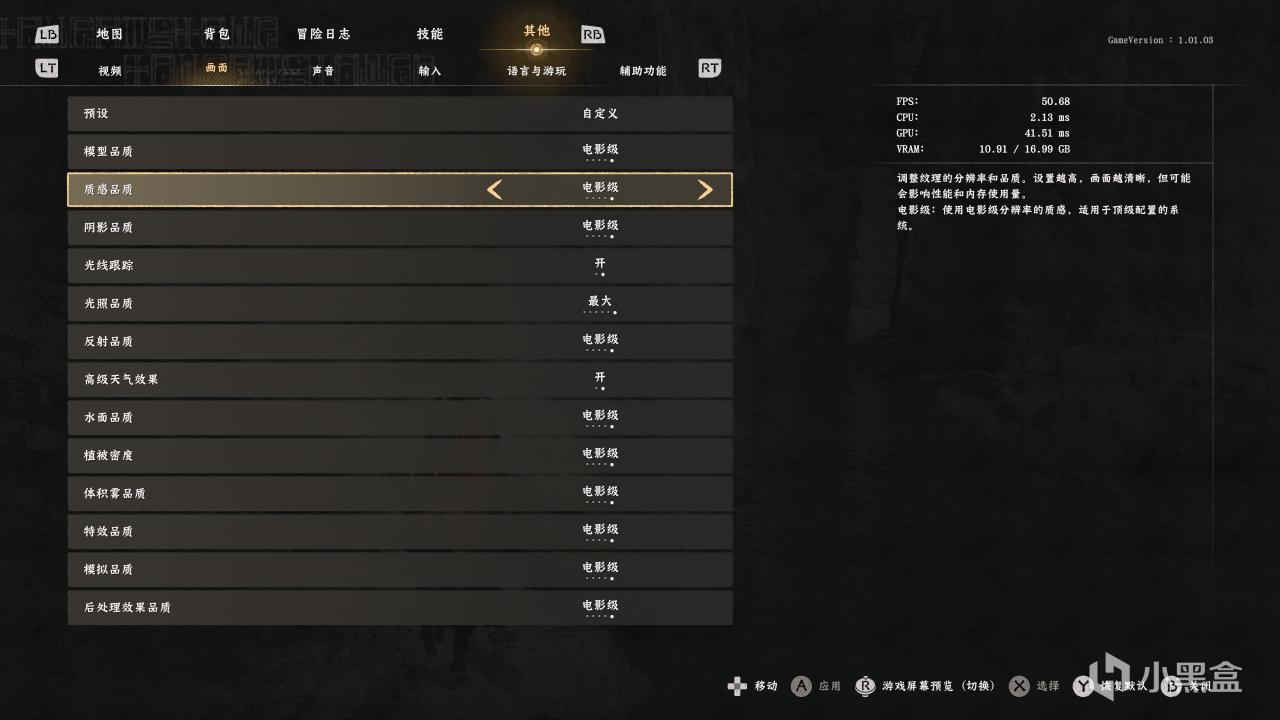 《红色沙漠》作为一款开放世界游戏,提供的画质选项自然丰富,包括常见的植被密度、水面品质、体积雾品质、模拟品质等选项,质感品质的翻译有点反直觉,其实就是纹理质量,能显著影响显存的。