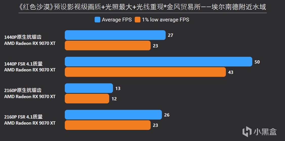 《红色沙漠》最高光追设置下,其4K的渲染强度只能说用RTX 5090才可胜任,对于RX 9070 XT来说,更适合的分辨率是2K,搭配FSR 4.1质量档实测平均帧率能达到50fps,还是同样的解决办法——实际游玩改为平衡档后,就能获得不错的流畅体验。