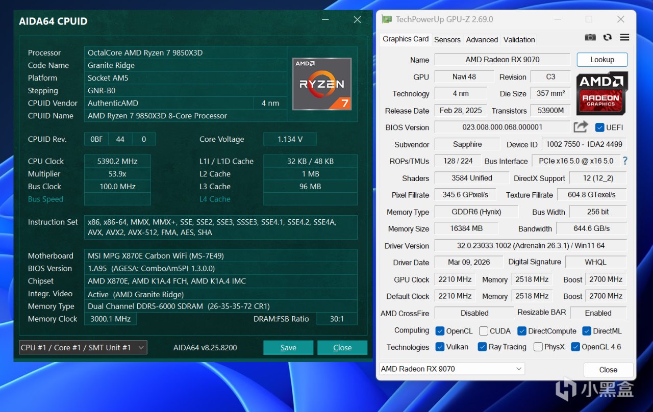 测试配置快速过一遍,CPU采用锐龙7 9850X3D最大程度降低CPU性能瓶颈,设置为PBO ENABLE状态,主板则是微星MPG X870E CARBON WIFI暗黑,搭配两根DDR5 6000C26 16GB*2内存套装,操作系统是Windows 26H1最新版本,显卡驱动是AMD Adrenalin 26.3.1 WHQL版本,针对《红色沙漠》有明确的性能优化。