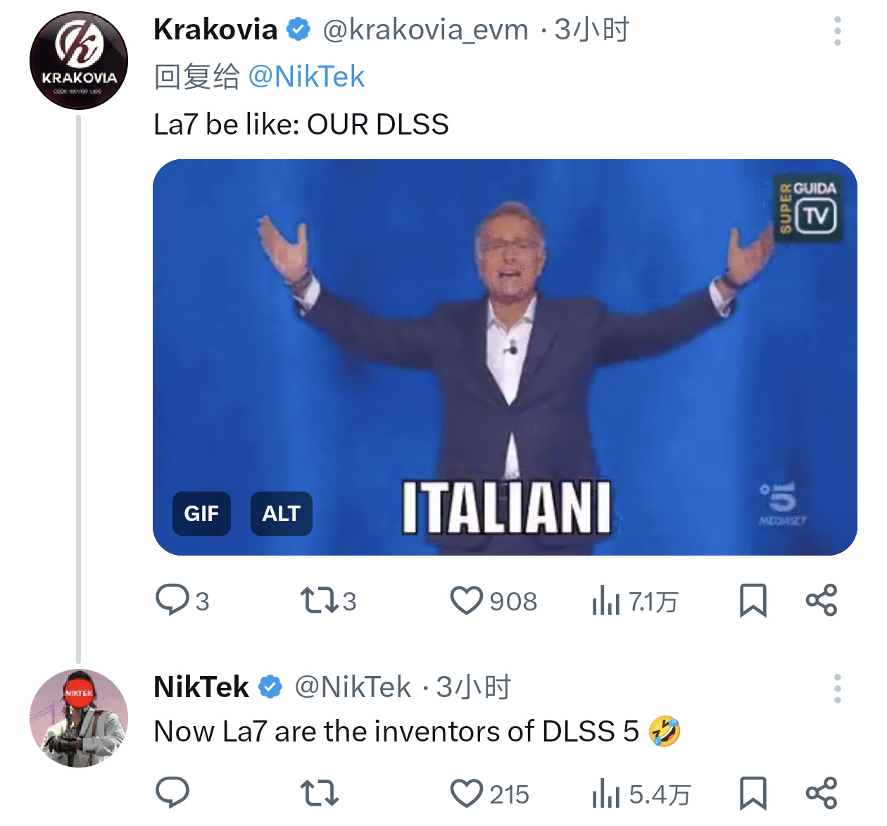 意大利电视台La7在节目中使用了英伟达(NVIDIA)官方发布的DLSS 5技术宣传片素材,随后反向向平台发起批量版权投诉,不仅下架了大量游戏博主的相关内容,连老黄自家的官方宣传视频也惨遭毒手。