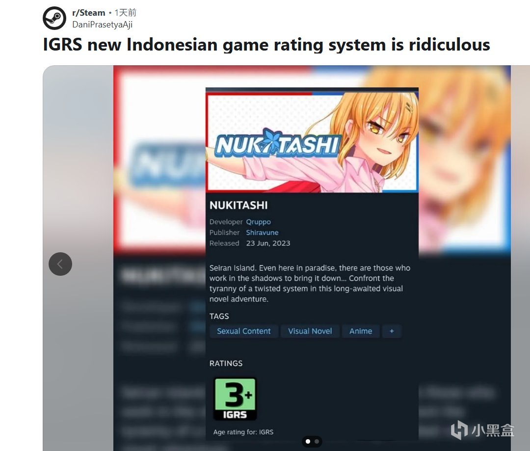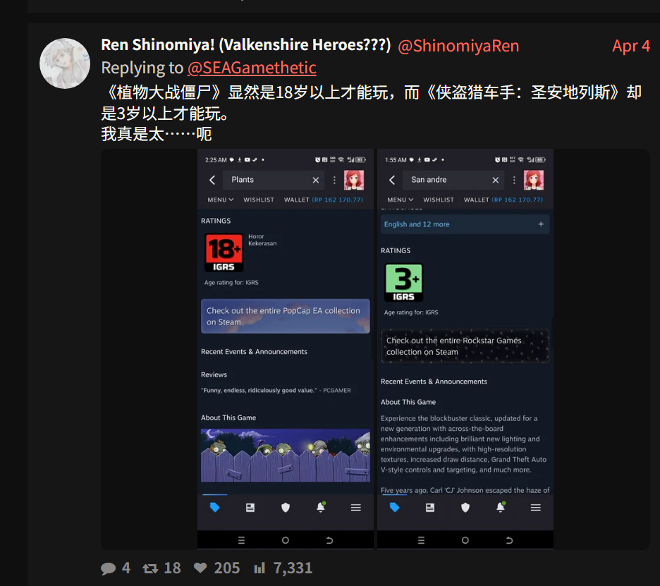 目前在该平台登录并参与正式评级的游戏数量并不多,而Steam此前针对印尼地区用户强制推送了该分级显示。对于那些尚未参与IGRS评级的游戏,系统采取了默认将其归类为“3+”全年龄段的处理方式。这种“一刀切”的默认逻辑,导致大量包含成人内容的游戏在没有任何审核的情况下,被荒诞地贴上了幼教级的标签。。