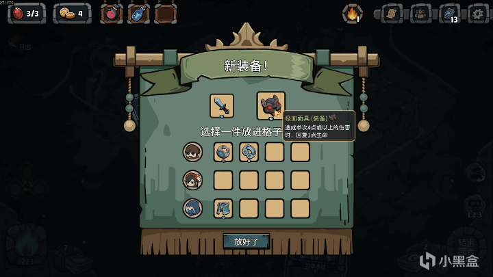 和杀戮尖塔的遗物不同的是,《黑夜轮回》是以“装备“代替”遗物”,每个角色都有4个栏位,而不是无限堆叠,并且装备只对本人有效,并不是团队增益,玩家需要合理分配装备给合适的人