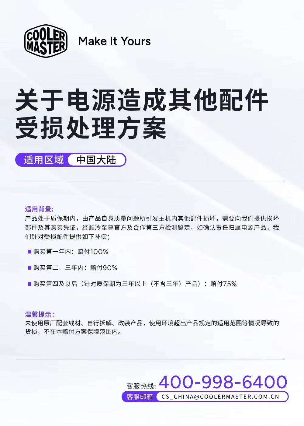 比如這款,購買一年內直接賠100%第二年第三年就是90%第四年以後是75%。也就是說,哪怕是電源掛了影響到其他配件,他也會給你賠。