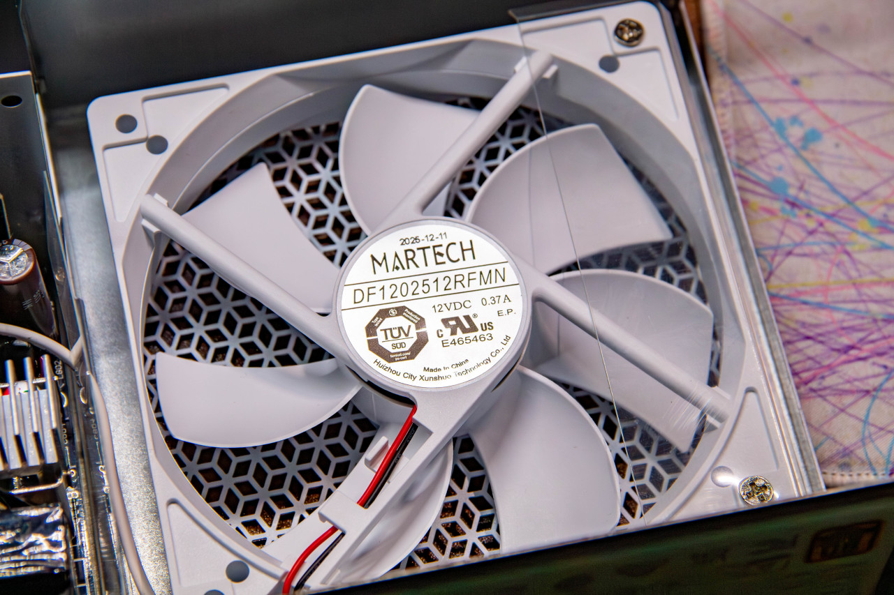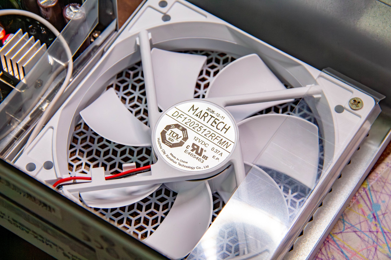風扇方面,用的是一個12025規格散熱風扇。雖然不支持智能啓停,但靜音效果相當不錯。在800瓦輸出之前,風扇轉速在800-900轉之間,運行聲音基本就是二十幾分貝,可以說幾乎聽不見