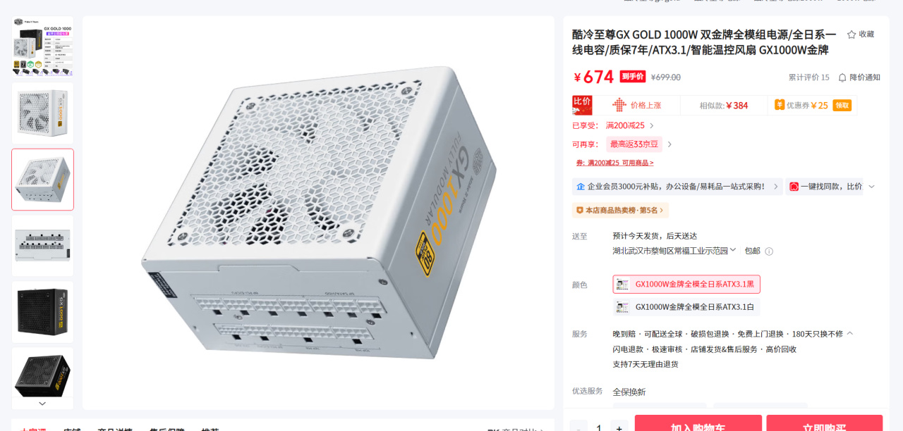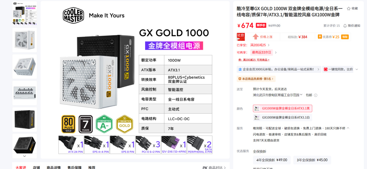 674元,7年質保,審美升級的酷冷至尊GX GOLD 1000W