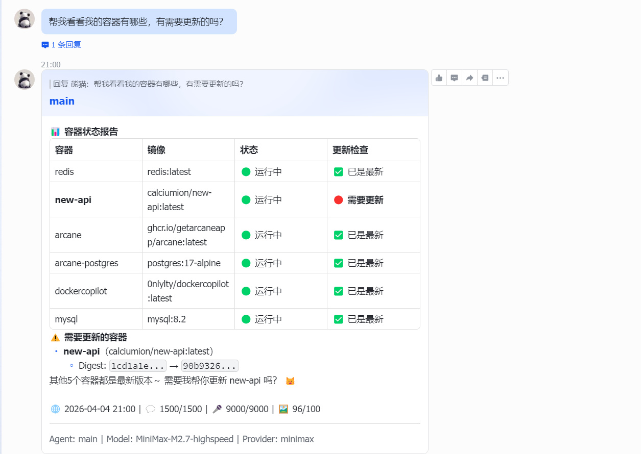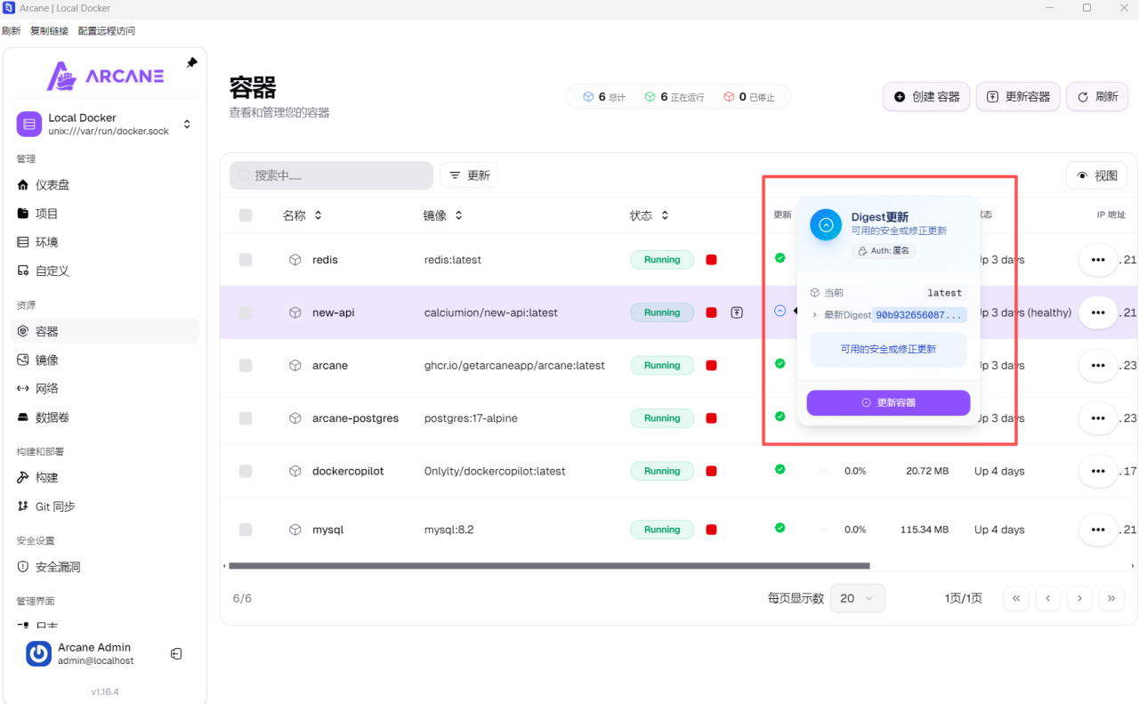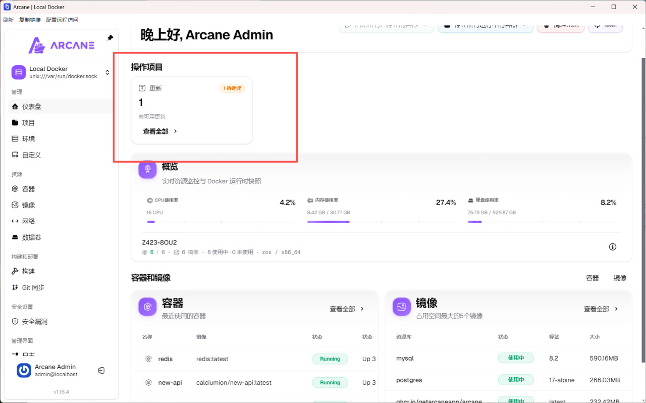 耐心等待它安裝Arcane-cli以及配置信息,之後就能看到它直接返回當前設備的Docker情況,比如容器與鏡像列表,同時如果有更新也會顯示。