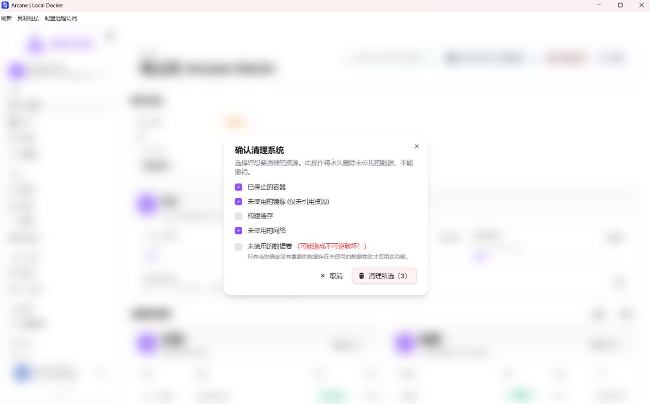 接着就是鏡像、網絡以及數據捲了,這些自行探索就行。這裏提一點,該項目儀表盤右上方提供了清理功能,可以選擇清理構建緩存未使用的鏡像網絡以及數據卷等。如果從來沒清理過可以看看,說不定能騰出一大批空間。