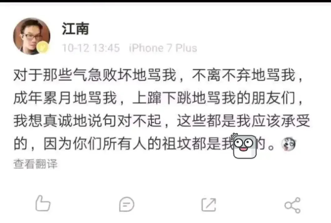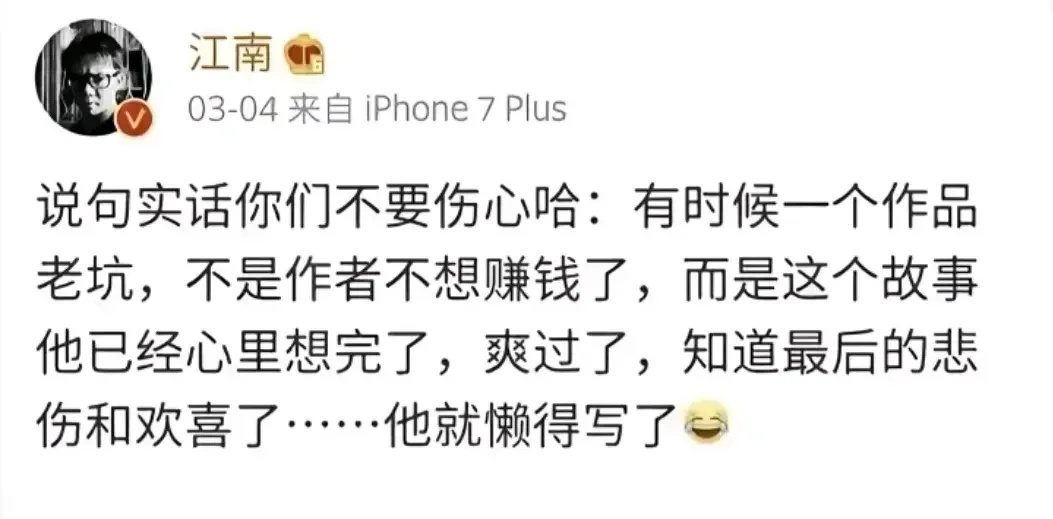 我们喜欢江南,是因为他书里那个“衰小孩”,那种对抗全世界的孤独感,曾经直击过最孤独的我们。可看看现在的江南,他不再是为了艺术或者为了给读者一个交代而写作的人。他坦言自己追求价值最大化,但在实践中,这种追求变成了不断食言、不断推翻设定、不断否定既往的过程。我们等了那么多年,等来的不是龙族完美的落幕,而是他为了商业价值不断重写、断更、甚至直接摆烂。他开始变得像他笔下的反派一样,满嘴跑火车,却再也给不出少年时那种一往无前的热血。