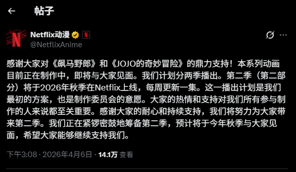 網飛宣佈JOJO SBR [2nd stage]將在今年秋季開播,大概跟着7月或者10月新番一起吧