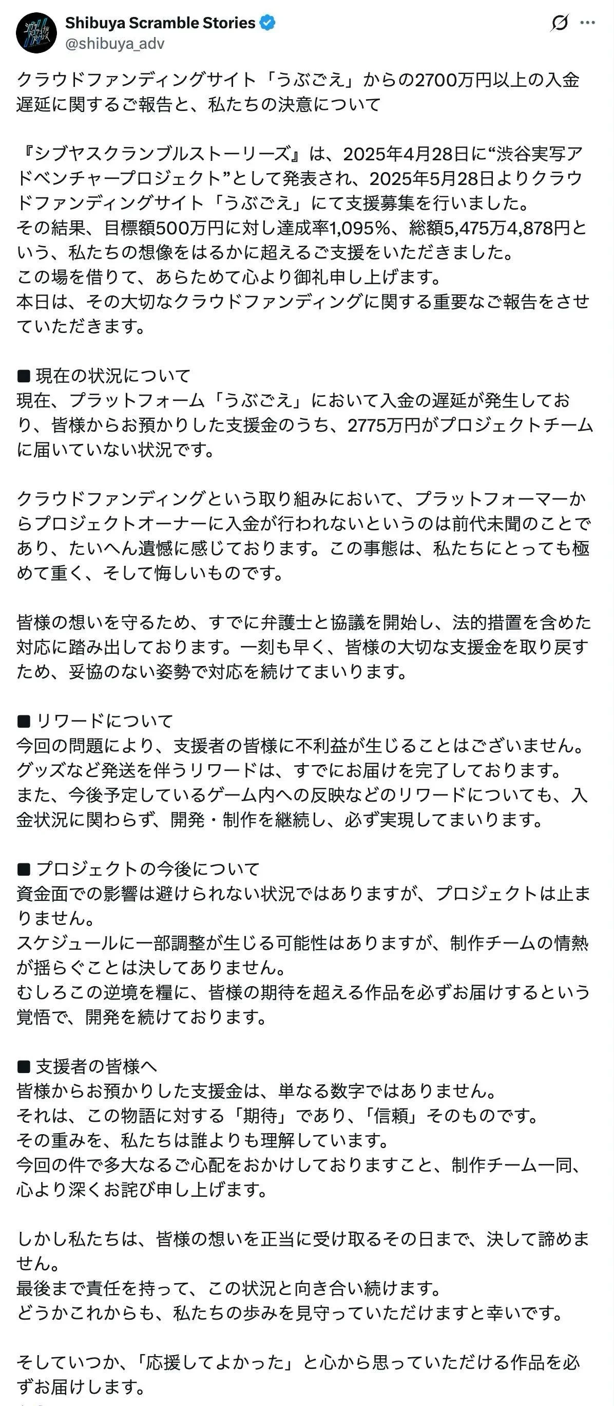 目前情况:《涩谷交叉物语》在遇到财务困境后,已得到其他公司的支持。开发商也与Ubgoe达成另一项协议,要求其分期付款。