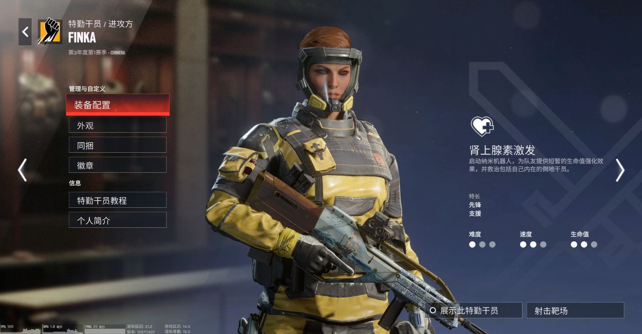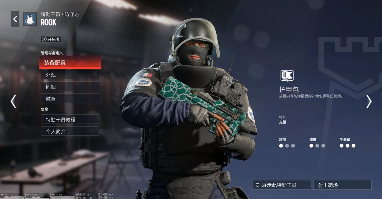 真正的“萌新之王”,彩六最容易上手的幹員。開局後擁有一個護甲包,可以放置到地面上。
