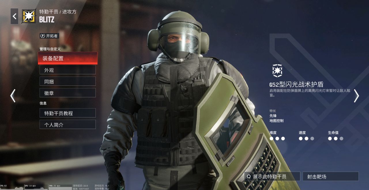 作爲彩六比較稀有的盾牌幹員,Blitz的主武器是一面閃光護盾,技能則是啓用盾上的閃光燈,致盲前方敵人。