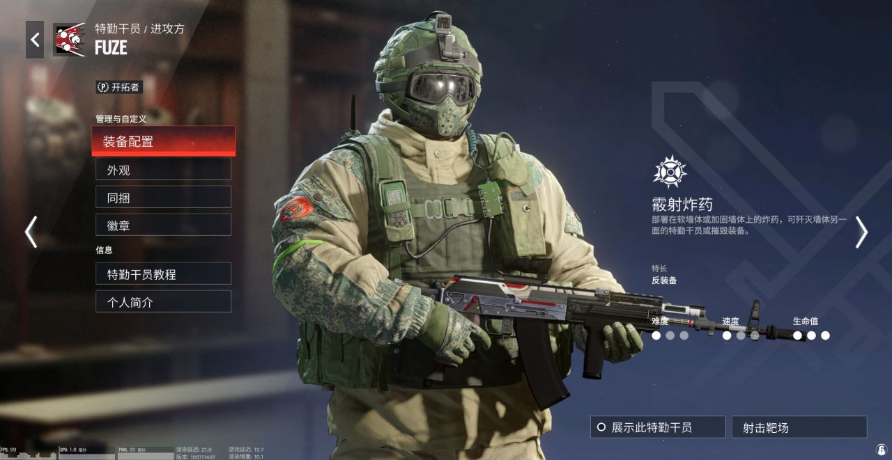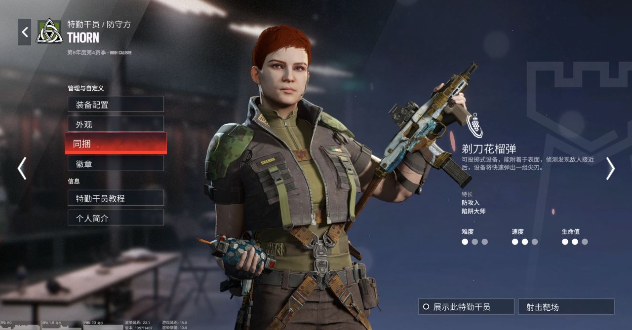 人稱“咚咚咚”,技能是可以放在門、牆體和窗戶上的炸藥,引爆後會立即向部署面的另一端在2秒內陸續投射5個榴彈。