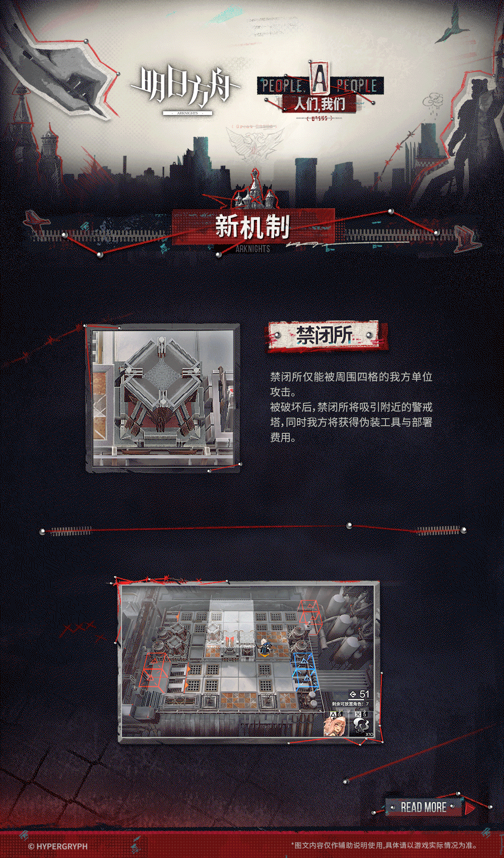 简单的说只能被周围4格打,打完给10费用+伪装工具,敌方防御塔会被吸引过去。禁闭所仅能被周围四格的我方单位攻击。被破坏后,禁闭所将吸引附近的警戒塔,同时我方将获得伪装工具与部署费用。