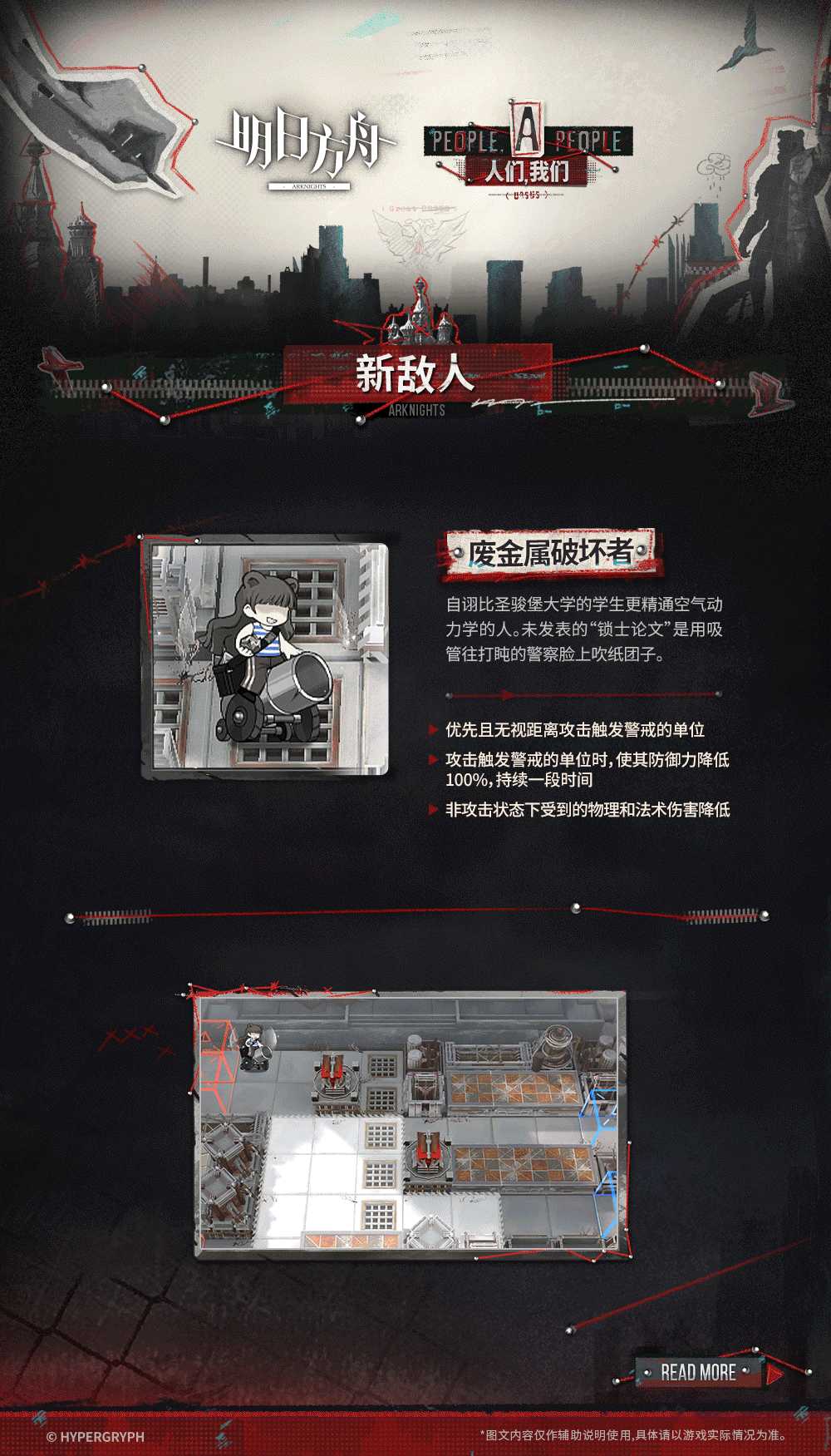 废金属破坏者,简单的说打触发警戒的无视距离且让其防御-100%,不打人的时候有物法减伤。优先且无视距离攻击触发警戒的单位。攻击触发警戒的单位时,使其防御力降低100%,持续一段时间。非攻击状态下受到的物理和法术伤害降低。