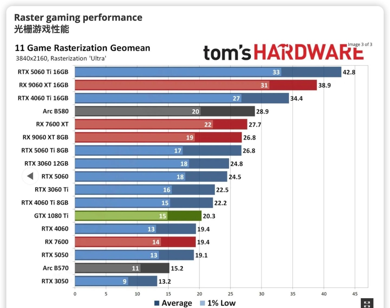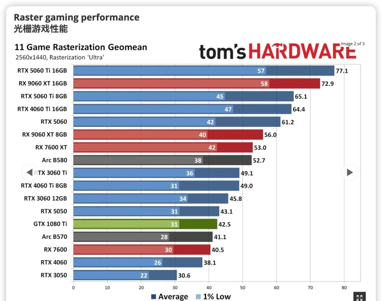在2K分辨率下,GTX 1080 Ti快追上RTX 5050,差距仅仅只有1.4%。