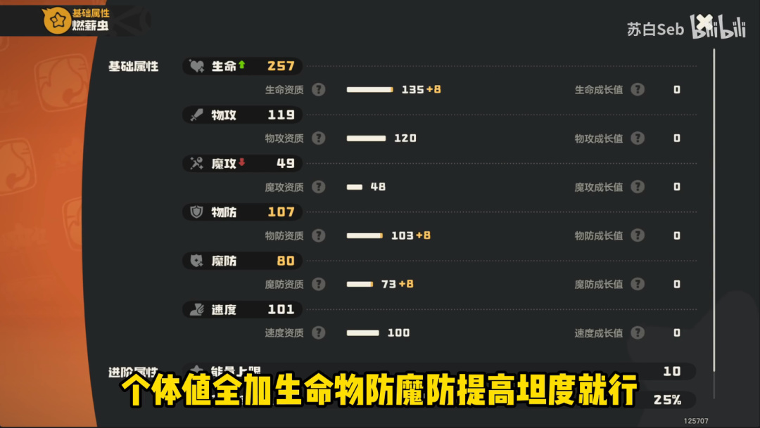 由於燃薪蟲是用灼燒層數造成固定百分比的傷害,所以物攻魔攻對燃心蟲沒用,個體值全加生命物防魔防提高坦度就行。