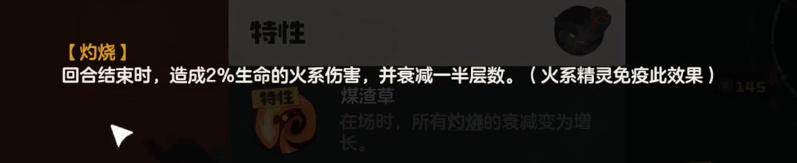 灼燒是一種負面buff,每回合結束,每層灼燒造成2%生命的傷害,但會衰減一半層數,火系精靈免疫。