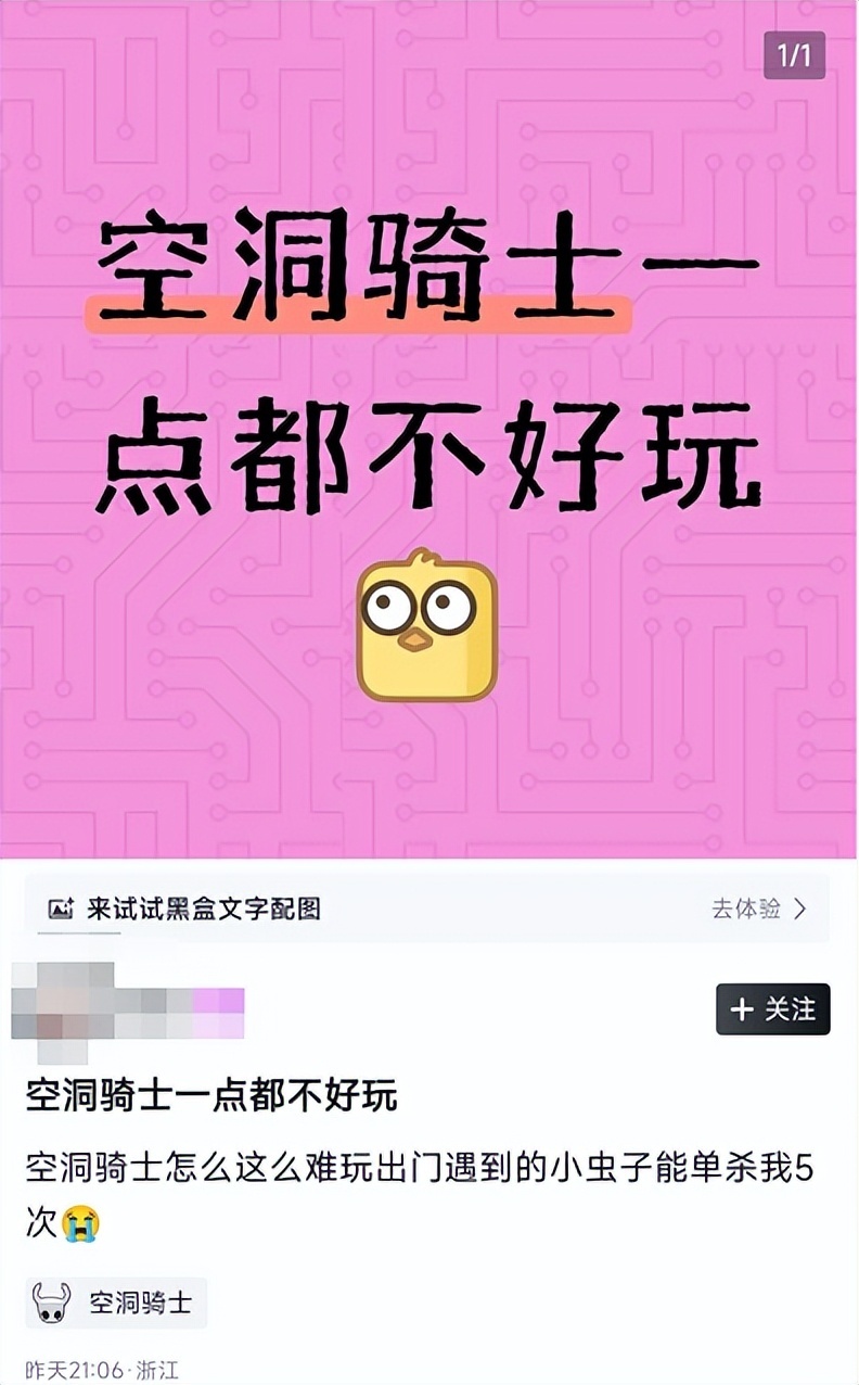 也有时候,既不用上图,又不用把游戏内容一一列举,直接把想说的话配在封面上,就足以直抒胸臆。比如有玩家锐评《空洞骑士》一点也不好玩,指引出门遇到的小虫子就能单杀他五次。