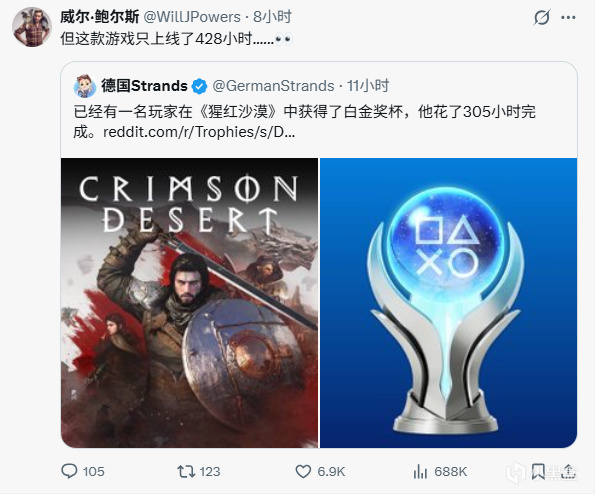 随后《红色沙漠》市场总监威尔·鲍尔斯也转发了该玩家的白金时间,并且配文《红色沙漠》也才上线了428小时。