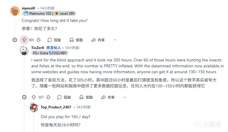 当然改玩家也对此做出来回应,表示游戏白金并不需要这么久的时间,只是他选择了盲目方法,花了305小时。其中超过60小时是最后打猎昆虫和鱼类,所以这个数字其实被夸大了。随着一些网站和指南中提供了更多数据挖掘信息,任何人大约在130~150小时内都能获得白金。
