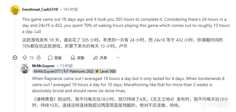 有玩家大概算了一下,这款游戏发布18天,通关花了305小时。考虑到一天有 24 小时,而 24x18 等于432小时,该玩家一天70%的时间都在玩这款游戏,折算下来大约每天约为13小时。