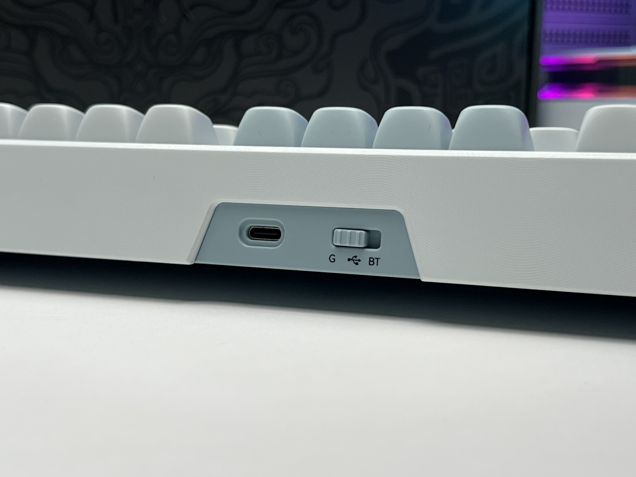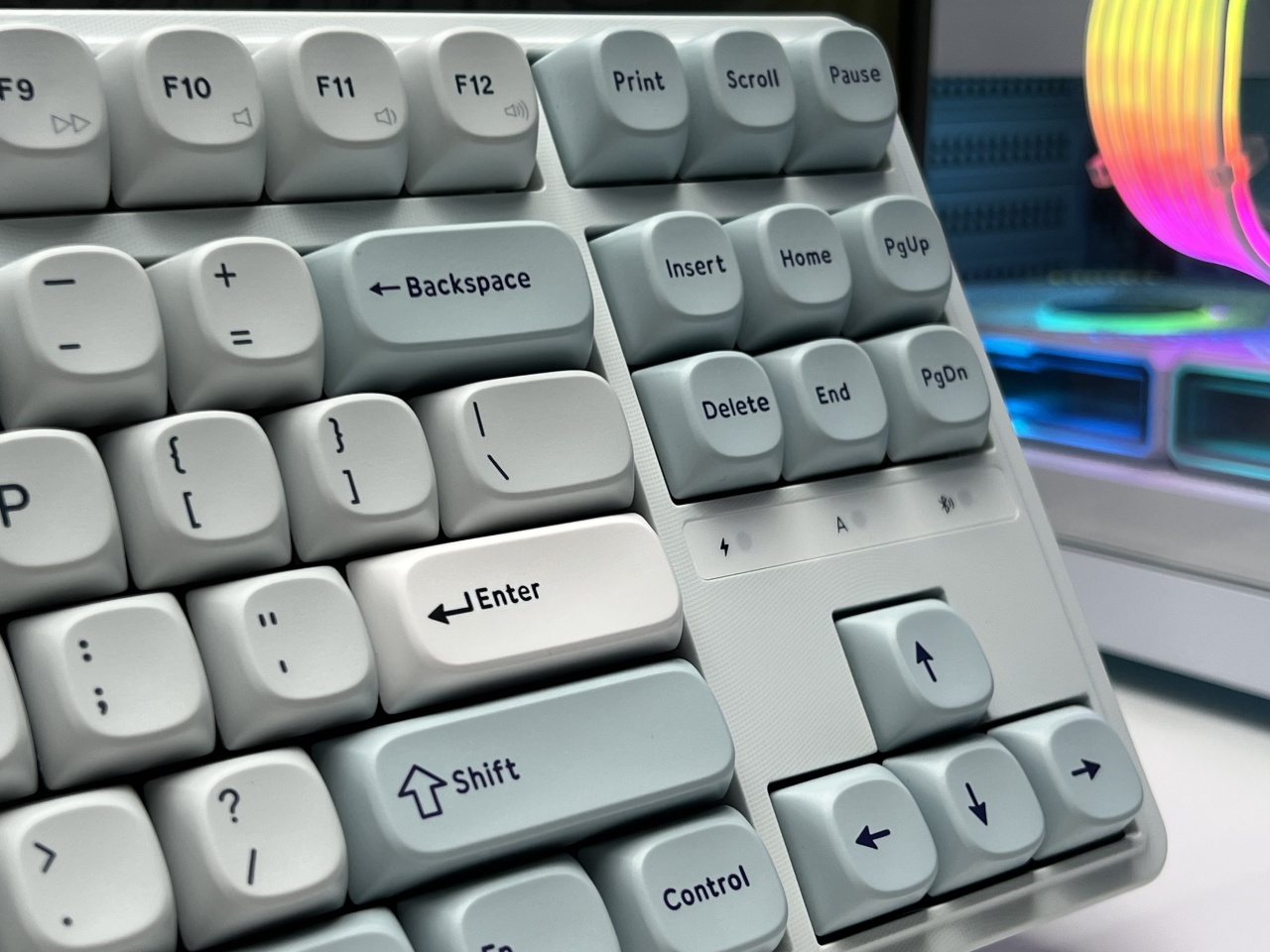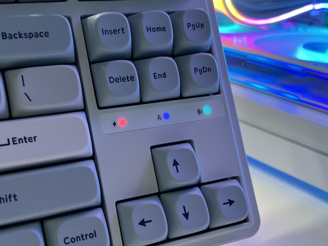 方向鍵上方是鍵盤的獨立狀態指示燈,能夠給到玩家鍵盤電量、大小寫、藍牙連接狀態的信息。相較於98配列的青龍4.0Ultra,配列布局變了,狀態指示燈位置也得變,不過只要有這個設計,查看鍵盤信息還是很直觀的。