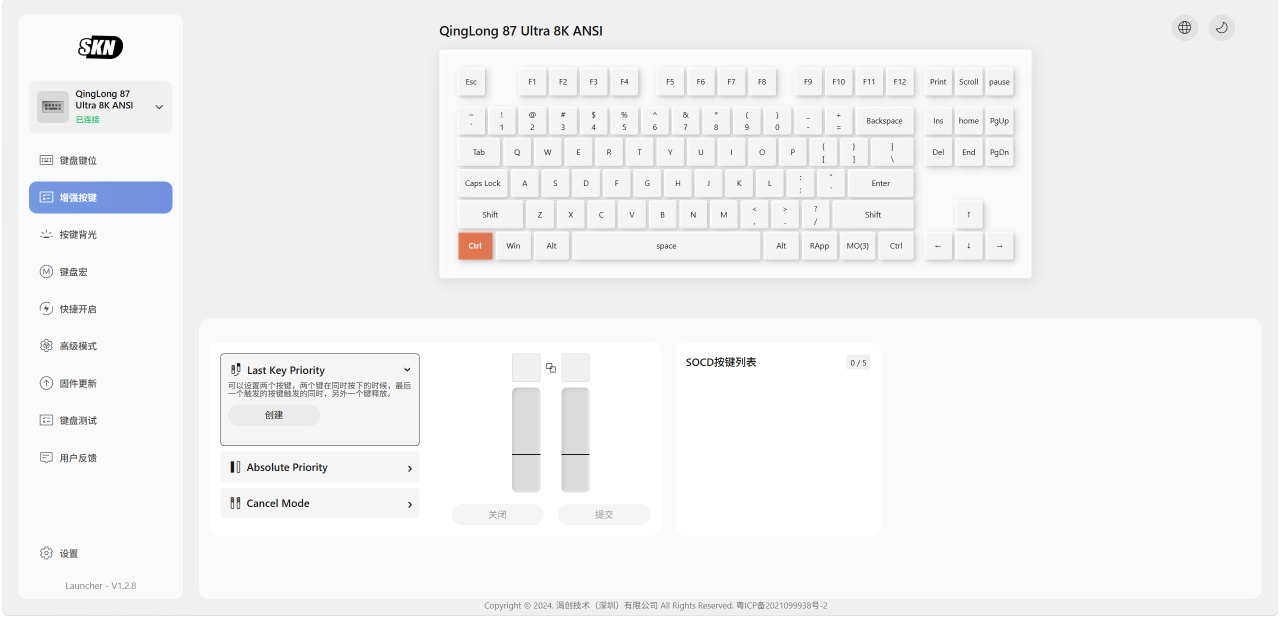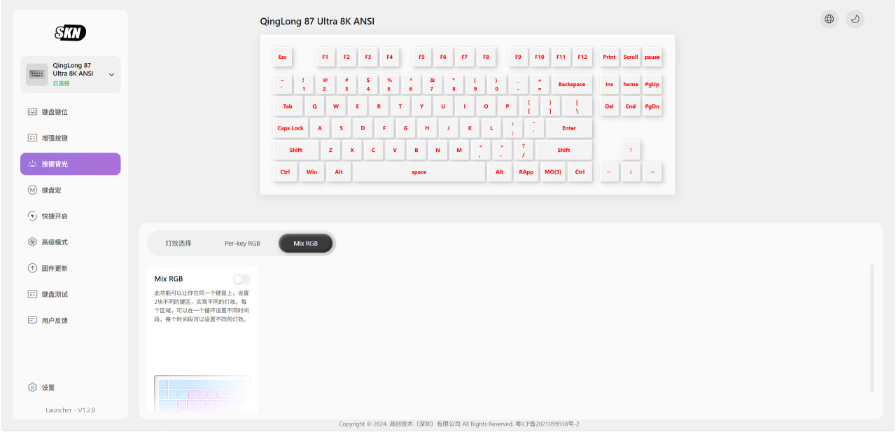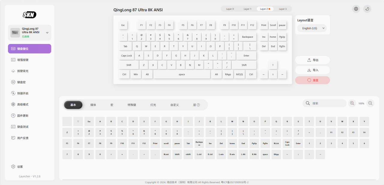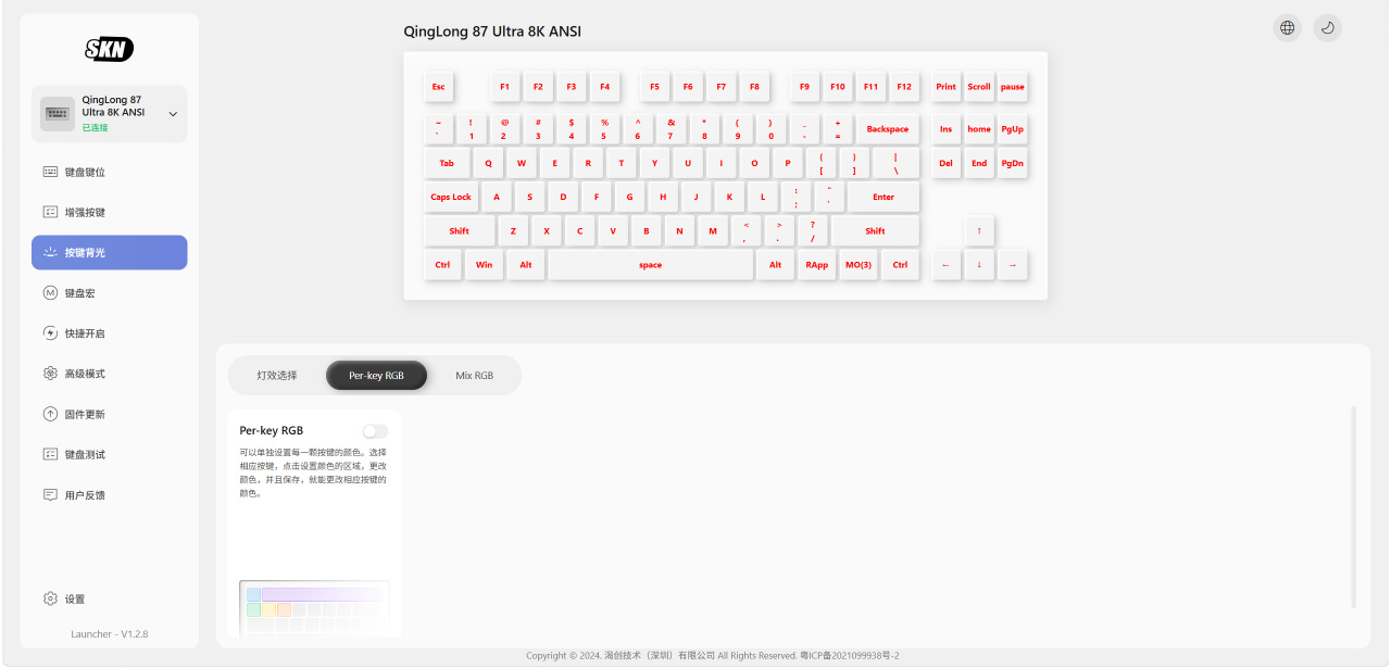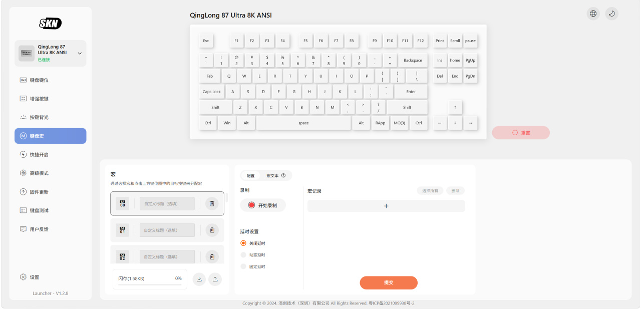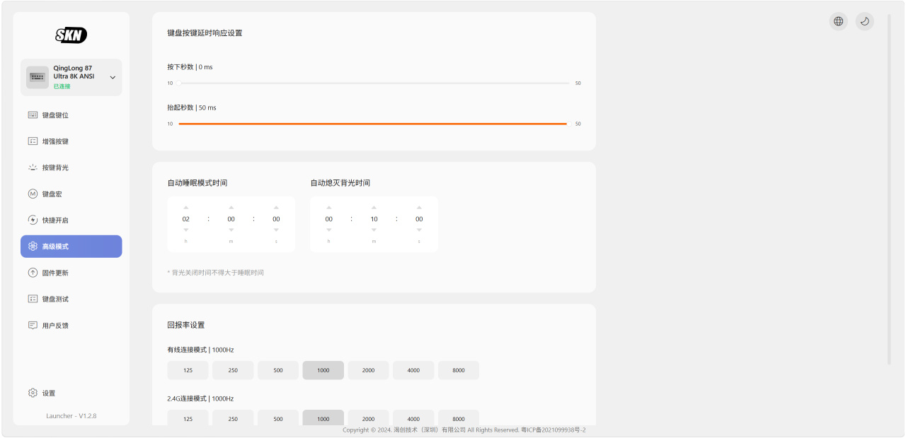驅動部分是SKN自研的網頁驅動(https://launcher.skn.net.cn/),界面UI很清晰,可以自定義按鍵、開啓鍵盤宏、修改鍵盤鍵位、調節按鍵背光、自定義高級燈效、自定義休眠時間以及固件更新。