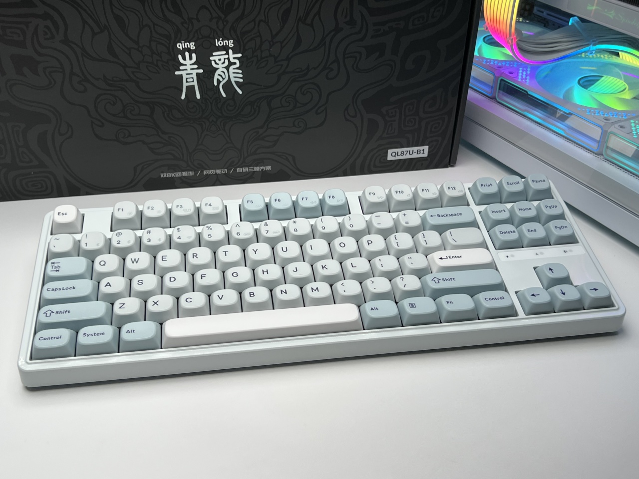 最近,SKN又出了青龍87 Ultra,這是一把87配列的鍵盤,沒有小鍵盤區,整體的設計其實和青龍4.0 Ultra如出一轍,包括配色都一樣,同樣的韶/漪兩種配色,以及後出的新配色凝,變化主要集中在細節上,下面帶大家看看這把鍵盤。