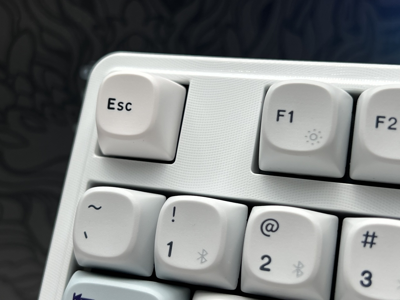 正面鍵帽是PBT材質的雙色注塑MDA高度鍵帽,灰色與霧霾藍的雙拼色;鍵帽手感細膩光滑,四個角都倒角,敲字是不會硌手;