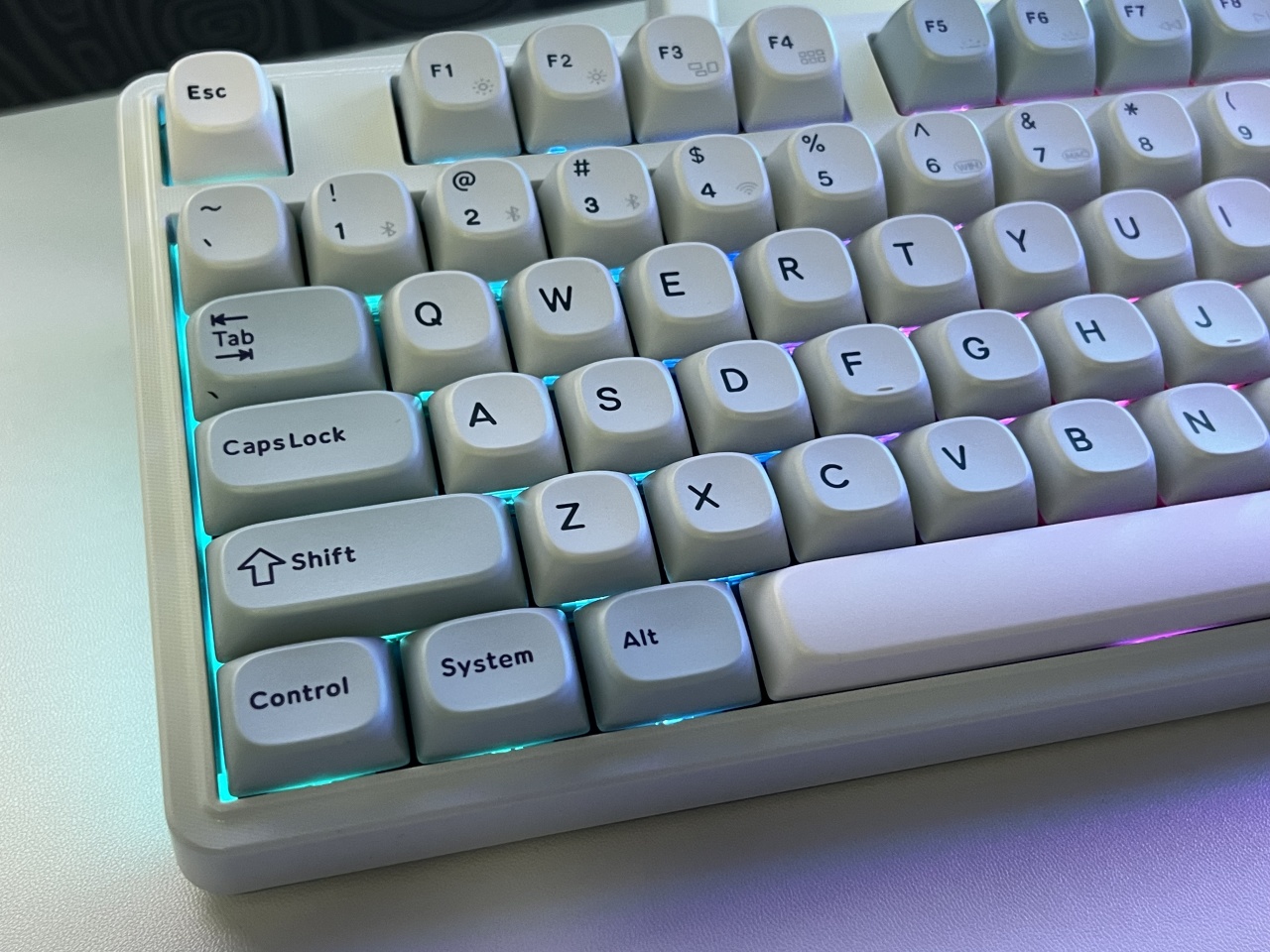 相較於原廠高度鍵帽,青龍87Ultra的MDA高度鍵帽做了人體工學考量,F區、數字區和底部功能鍵區都向字母區做了一定的角度傾斜,這種設計會讓手指在打字過程在更舒服,更易敲擊到邊緣按鍵。