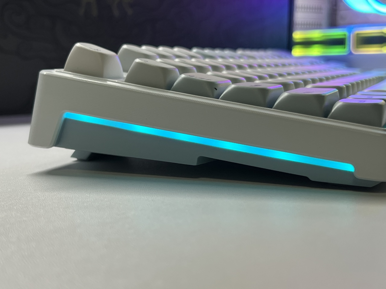 “天地蓋”的上下底殼拼接方式,SKN巧妙的將RGB燈條藏在了上下底殼側邊接縫處,只有鍵盤通電才能看到RGB燈條,透光性不錯,也算是彌補了鍵帽不透光的劣勢。