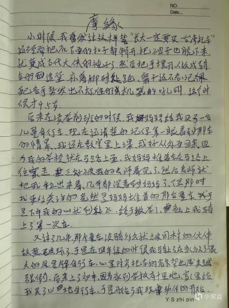 2004年,讀初三的時候,某天同學騎來一輛真正的摩托車,他鼓起勇氣借來嘗試,反覆四次才成功打火起步,當離合與油門配合到位、車子向前衝出去的那一刻,他理解了風掠過耳邊的感覺。