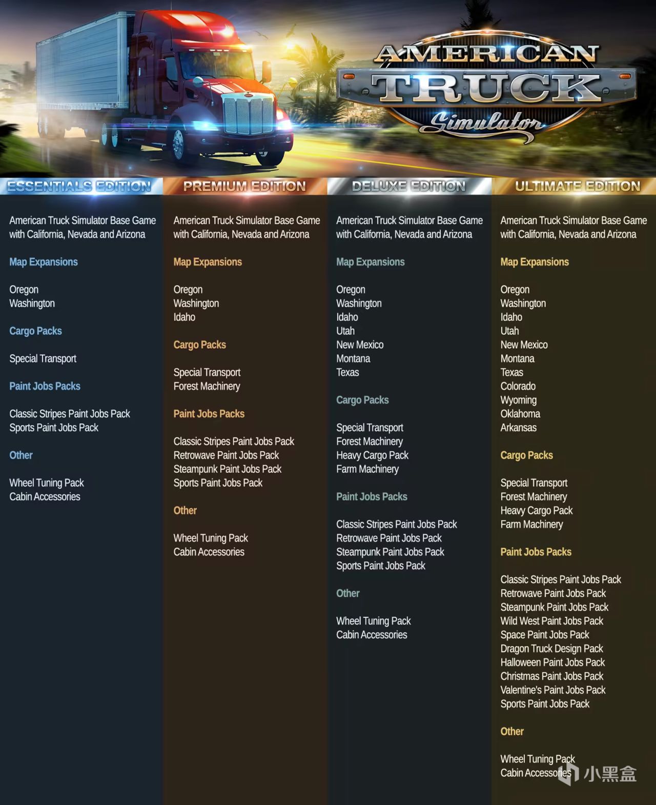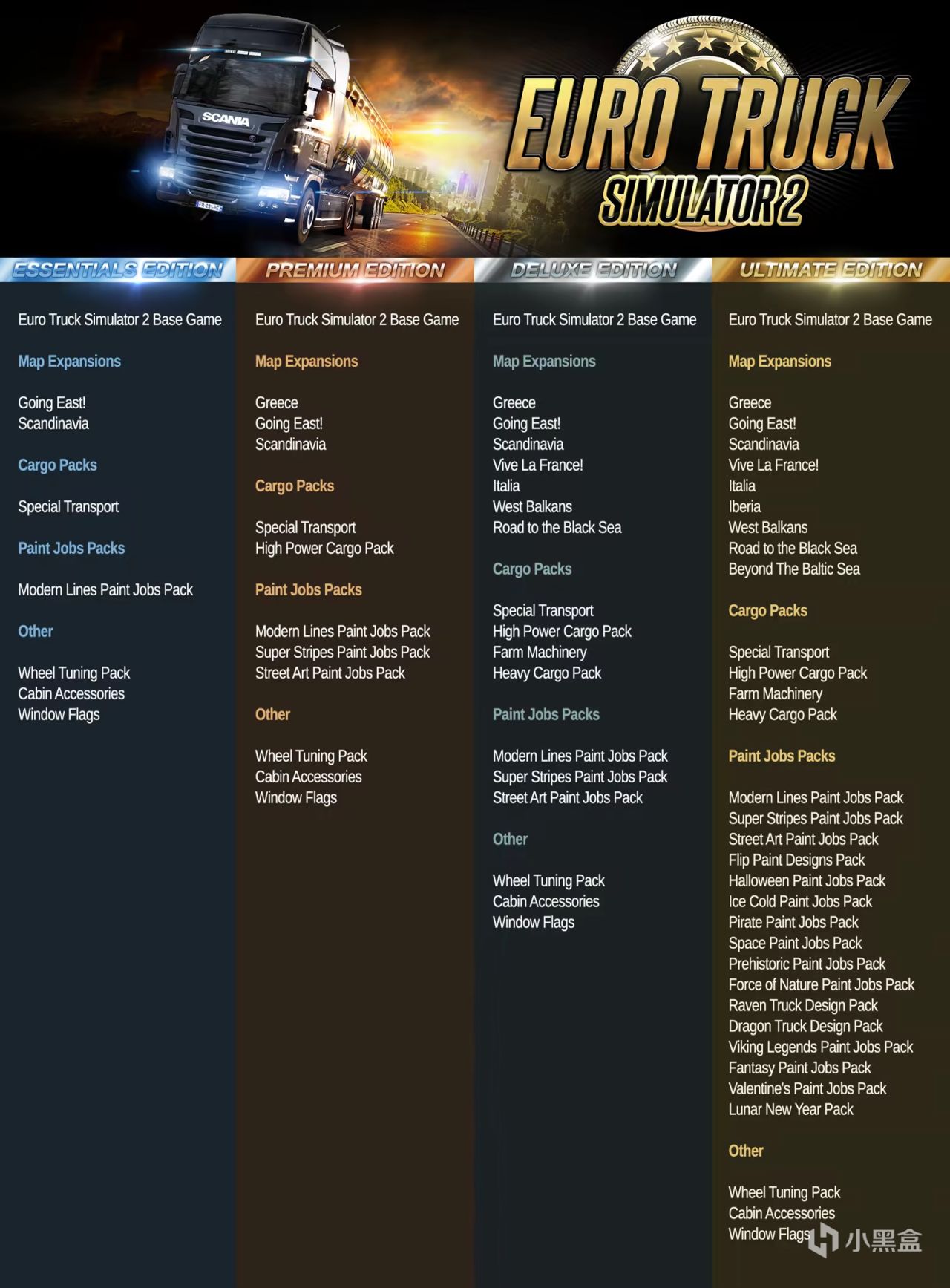 豪华包包含本体、7个地图扩展包、4个货物扩展包、3个涂装包和3个改装包。