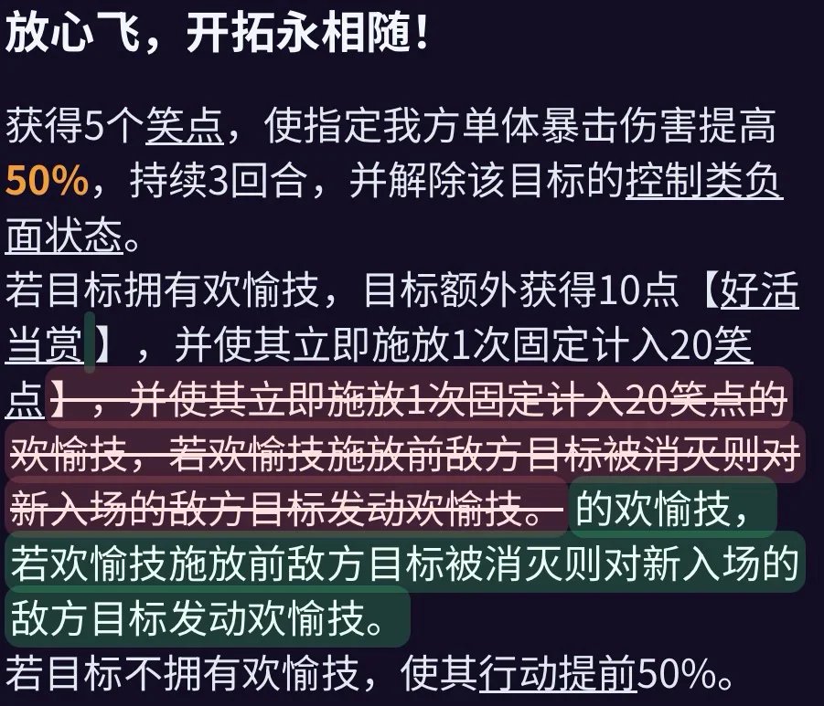 施放歡愉技時,使自身暴擊傷害提高100%,持續3回合。