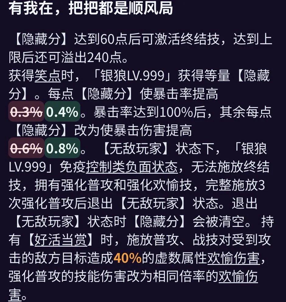 強化普攻期間造成的歡愉傷害增笑50%。敵方目標進入戰鬥時,會被植入【禁限弱點】:擁有全屬性弱點並且全屬性基礎抗性降低至0(若基礎抗性爲0則改爲對應屬性抗性降低20%)。